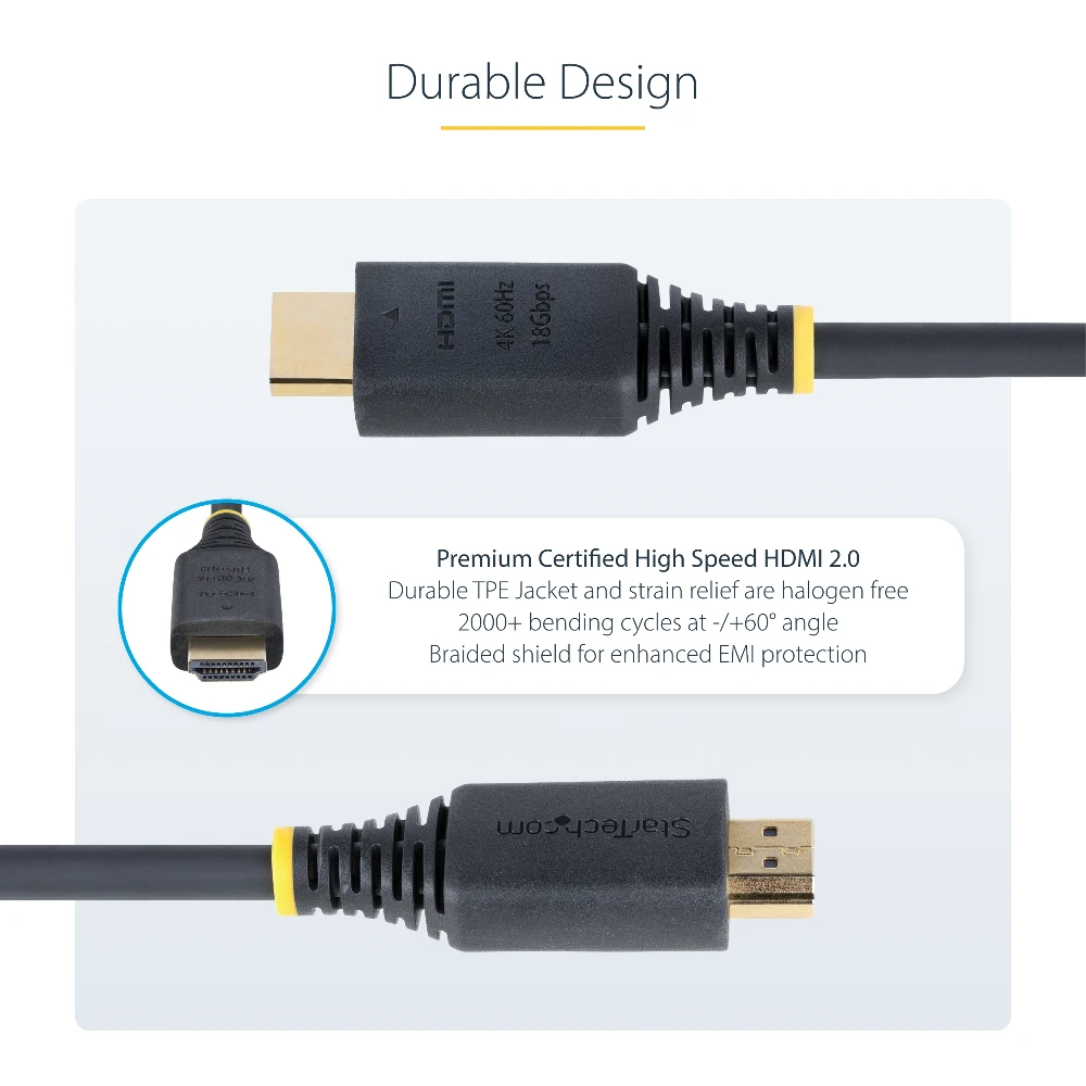 This HDMI 2.0 Cable is constructed with braided aluminum mylar shielding to minimize EMI for clear, consistent audio/video output and long-term reliable performance.