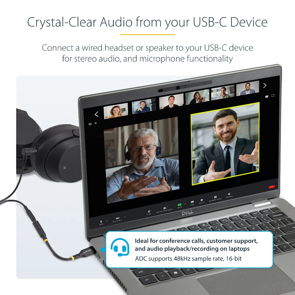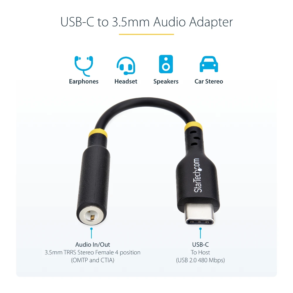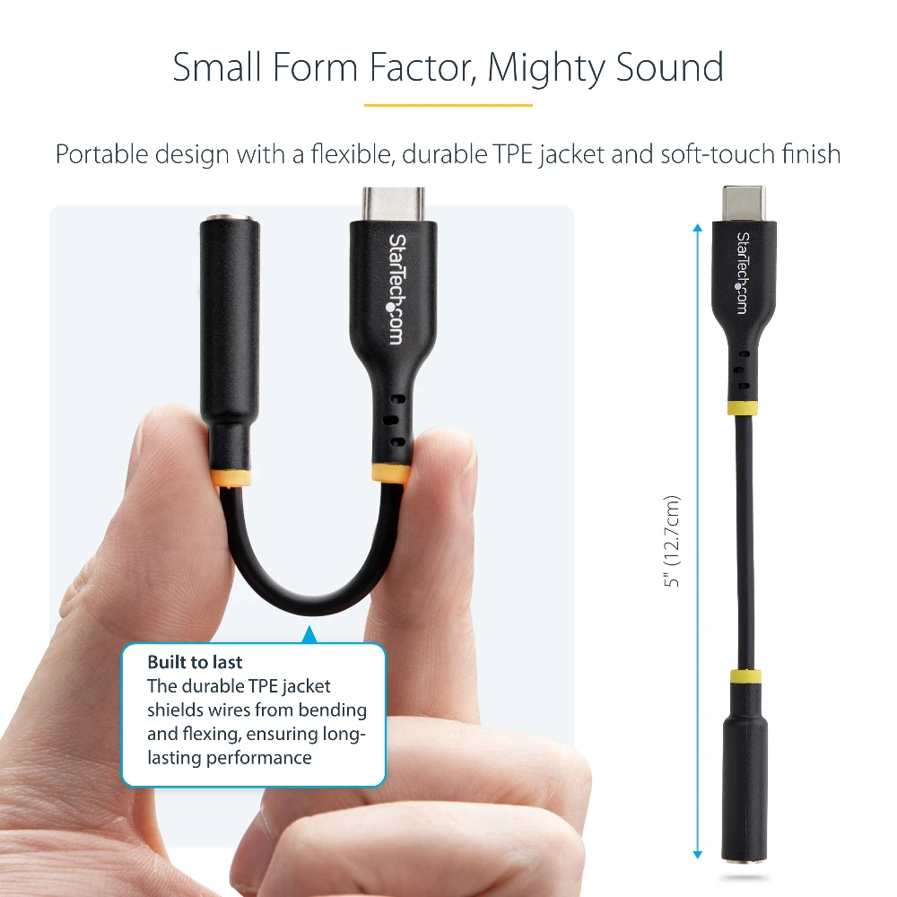 StarTech.com 5in (12.7cm) USB-C to 3.5mm TRRS Headphone/Headset Jack Audio Adapter, 32-bit DAC, USB C Aux Dongle for PC/Phone StarTech.com 5in (12.7cm) USB-C to 3.5mm TRRS Headphone/Headset Jack Audio Adapter, USB Type-C Aux Dongle, 32-bit DAC, Supports USB-C/Thunderbolt, Laptop/Phone/Tablet. Connector 1: USB Type-C 2.0, Connector 2: 3.5 mm, Cable length: 0.127 m. Product colour: Black - Connect a 3.5mm audio headset/earpiece or speaker to a USB Type-C-enabled device - Audio with 32-bit DAC; Supports stereo sound and mic; TRRS jack - High-quality audio (44.1 to 384kHz and 16/24/32-bit sample) w/ 105dBA SNR; Up to 94DB SNR Mic input; Realtek ALC4030U chipset - Supports USB-C/Thunderbolt computers (Windows/Mac OS)/phones/tablets - Compact design w/ durable TPE jacket; Compact 5-inch long design - USBC aux dongle is ideal for conference calls/audio playback and recording Use this audio adapter cable to add 3.5mm audio output to a USB-C device