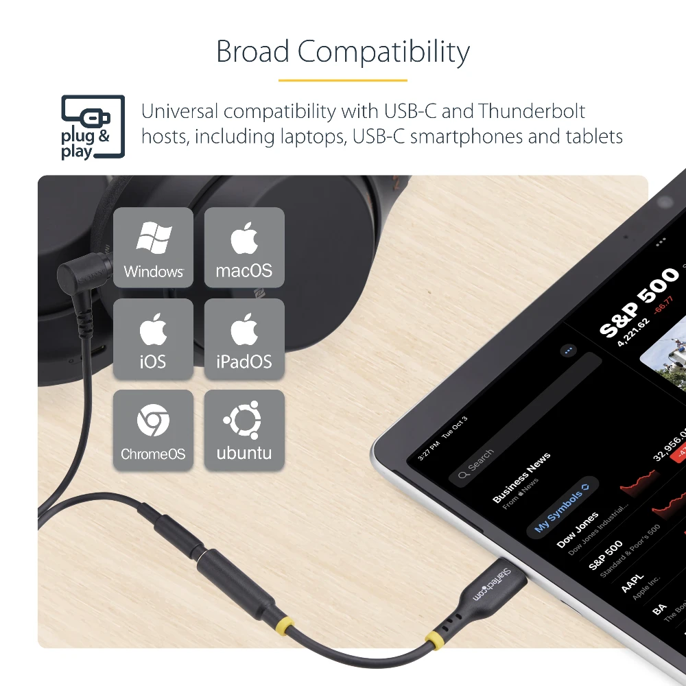 This versatile aux audio adapter is universally compatible with USB-C and Thunderbolt devices, including Windows, macOS, and Linux computers, as well as phones and tablets running iOS or Android. It supports wired headphones and headsets (including models with in-line controls), making it an ideal solution for using existing audio gear and eliminating the need for Bluetooth audio solutions.