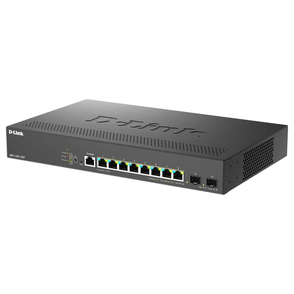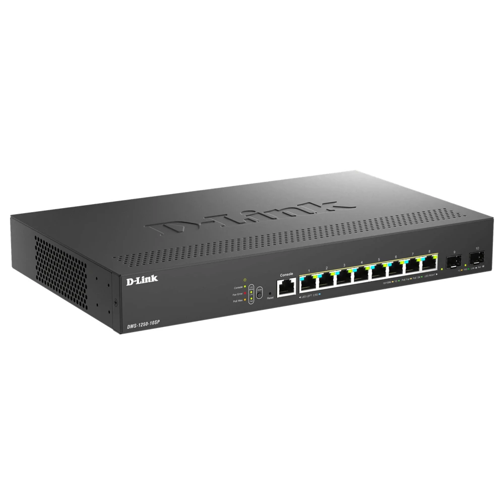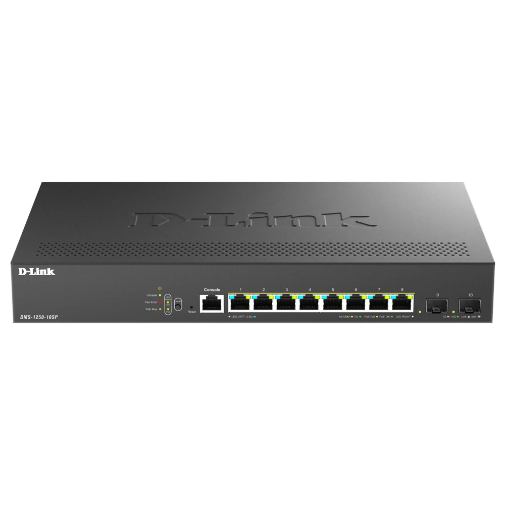 D-Link DMS-1250-10SP/E. Switch type: Managed. Basic switching RJ-45 Ethernet ports type: 2.5G Ethernet (100/1000/2500), Basic switching RJ-45 Ethernet ports quantity: 8. MAC address table: 16000 entries, Switching capacity: 80 Gbit/s. Networking standards: IEEE 802.3ab, IEEE 802.3af, IEEE 802.3an, IEEE 802.3at, IEEE 802.3az, IEEE 802.3bt, IEEE 802.3bz,.... Power connector: AC-in jack. Power over Ethernet (PoE). Rack mounting