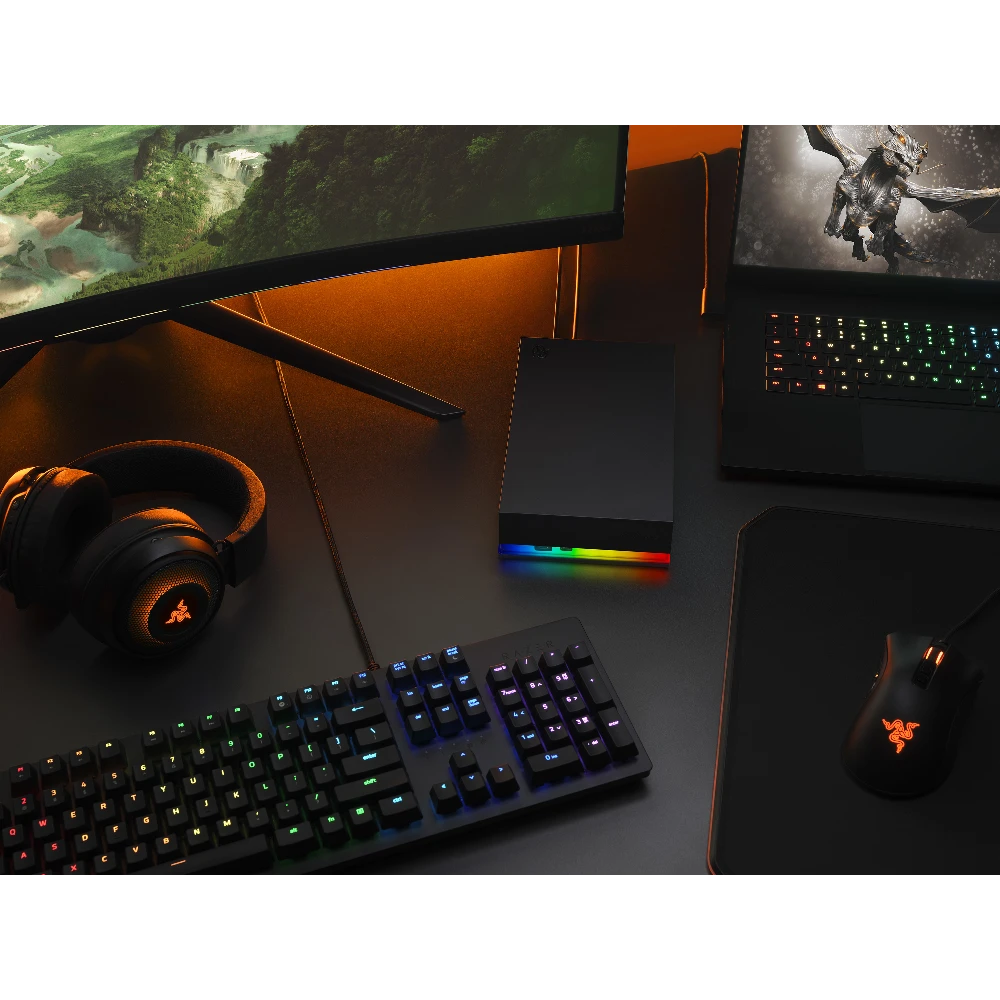 Light up your gaming experience with the Seagate FireCuda Gaming Hub. Featuring up to 16 TB of capacity, create an immersive atmosphere with customisable RGB LED lighting. Plus, dual front-facing USB-C and USB-A ports enable you to connect and power all your peripherals in one place.