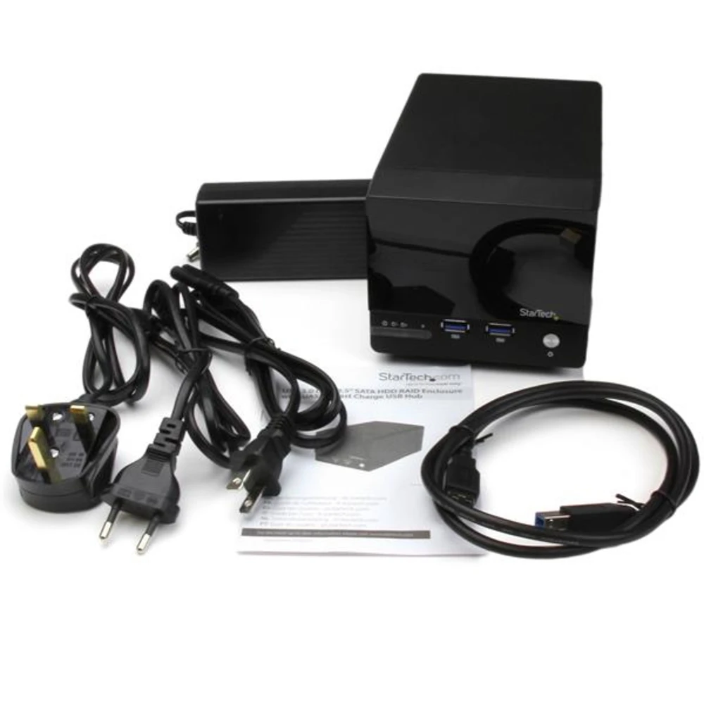 StarTech.com USB 3.0 Dual 3.5in SATA III Hard Drive RAID Enclosure with Fast Charge USB Hub & UASP - 3.5in SATA HDD Enclosure w/ USB Hub StarTech.com USB 3.0 Dual 3.5in SATA III Hard Drive RAID Enclosure with Fast Charge USB Hub & UASP. Product type: HDD enclosure. Number of storage drives supported: 2, Storage drive size: 3.5", Supported storage drive interfaces: Serial ATA, Serial ATA II, Serial ATA III, Maximum storage capacity: 6 TB. Data transfer rate: 5 Gbit/s. RAID levels: 0, 1, BIG, JBOD. Product colour: Black. USB connector type: USB Type-A, USB Type-B Connect two 3.5" SATA III hard drives to your computer through USB 3.0 with UASP in a RAID array, and charge or connect USB devices with the built-in 2-port USB 3.0 fast charge hub