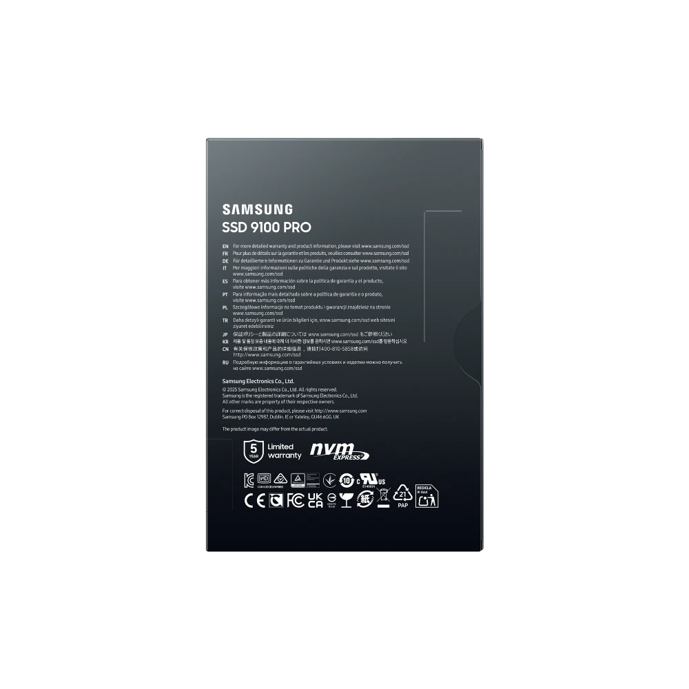9100 PRO, PCIe 5.0, NVMe M.2 SSD Samsung 9100 PRO PCIe® 5.0 NVMe™ M.2 SSD - 4 TB. SSD capacity: 4 TB, SSD form factor: M.2, Read speed: 14800 MB/s, Write speed: 13400 MB/s, Component for: PC/Laptop Breakthrough PCIe® 5.0 performance