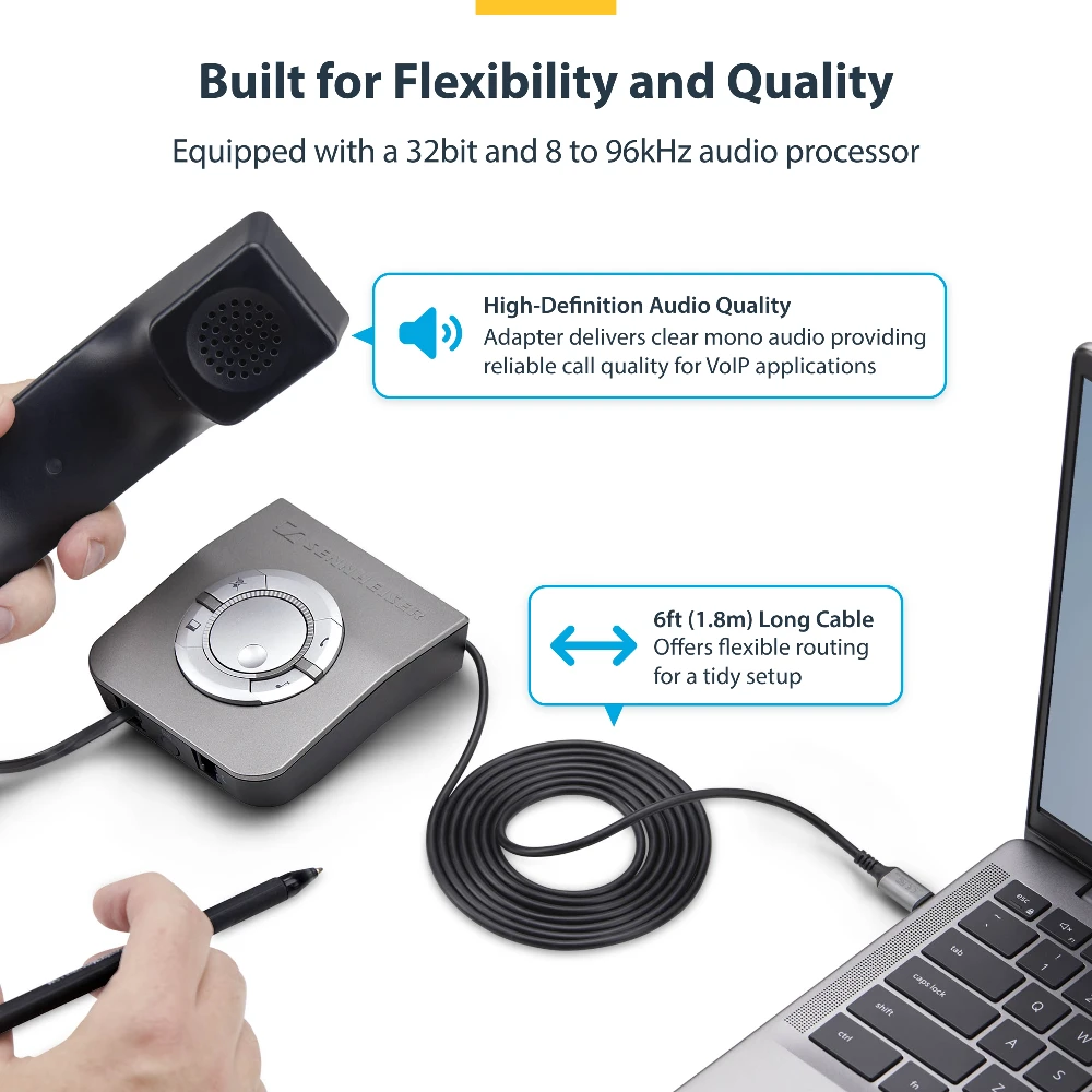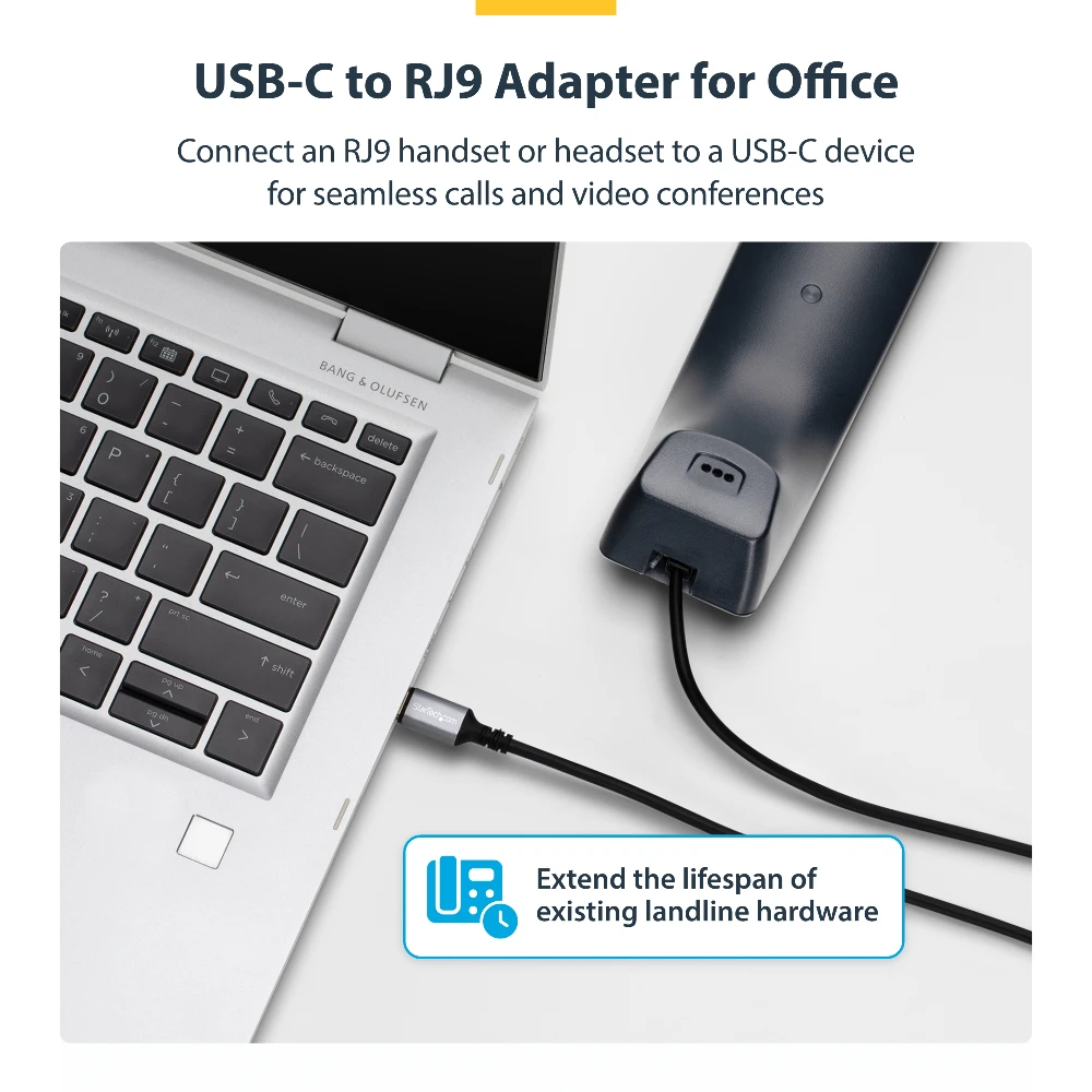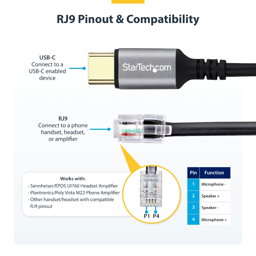 StarTech.com UR9-HEADSET-ADAPTER. Connector 1: USB-C, Connector 2: RJ-9, Cable length: 1.8 m. Product colour: Black
