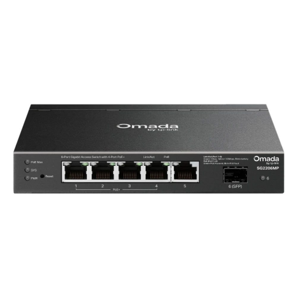 RJ-45, SFP, PoE+, 63W, 30W, 12Gbps TP-Link SG2206MP. Switch layer: L2. Basic switching RJ-45 Ethernet ports type: Gigabit Ethernet (10/100/1000), Basic switching RJ-45 Ethernet ports quantity: 5, Installed SFP modules quantity: 1. MAC address table: 8000 entries, Switching capacity: 12 Gbit/s. DC input voltage: 53.5 V. Power over Ethernet (PoE). Rack mounting Multiple Application Scenarios