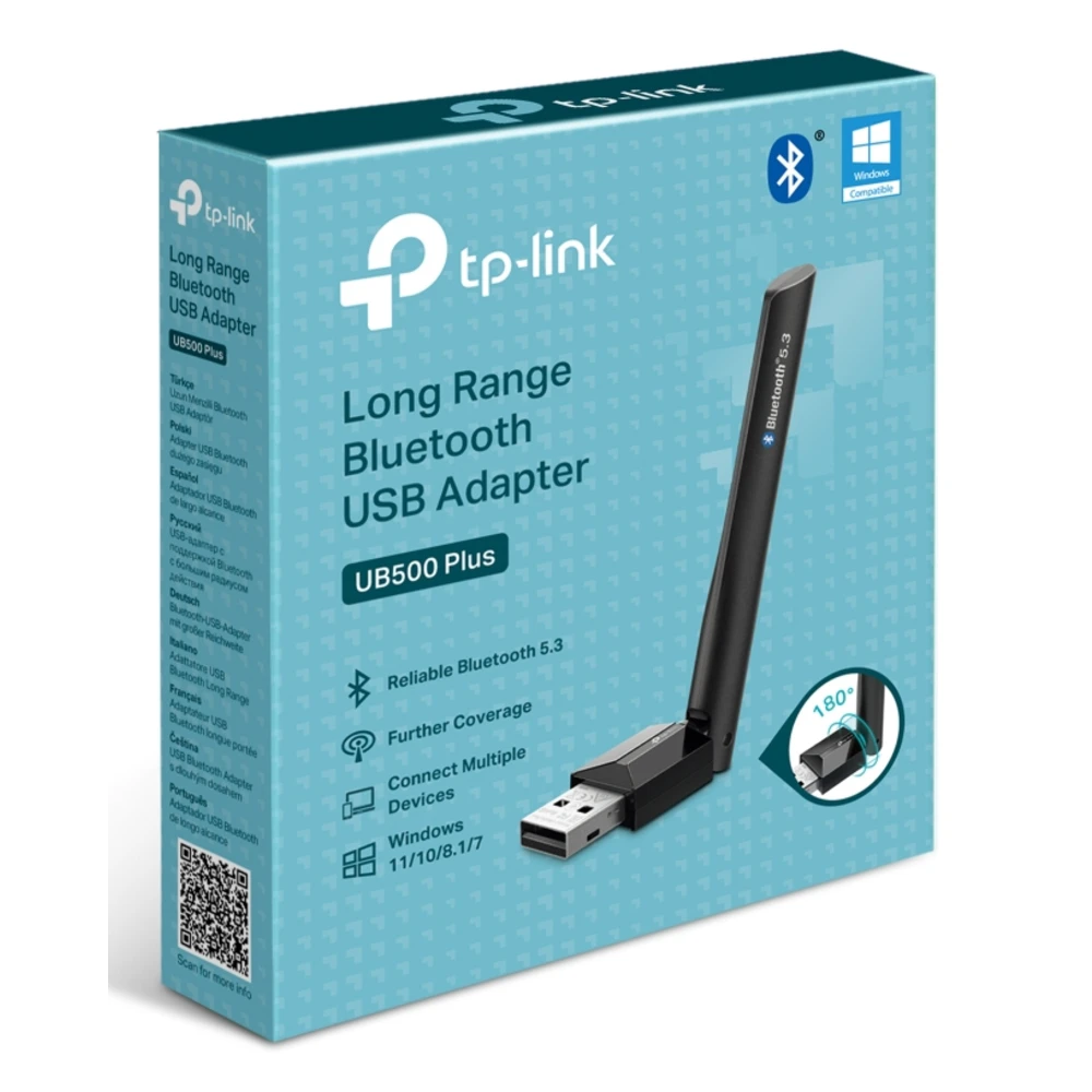 Bluetooth 5.3, Wireless, Windows OS, 0 - 40?, Black, 81 × 42 × 16.8 mm TP-Link UB500 Plus. Host interface: USB Type-A, Output interface: Bluetooth, Host interface gender: Male. Product colour: Black, Purpose: PC / Notebook / Tablet. Windows operating systems supported: Windows 10, Windows 11, Windows 7, Windows 8.1. Width: 16.8 mm, Depth: 42 mm, Height: 81 mm. Quantity per pack: 1 pc(s), Package type: Box Bluetooth 5.3: Faster Speeds, More Robust