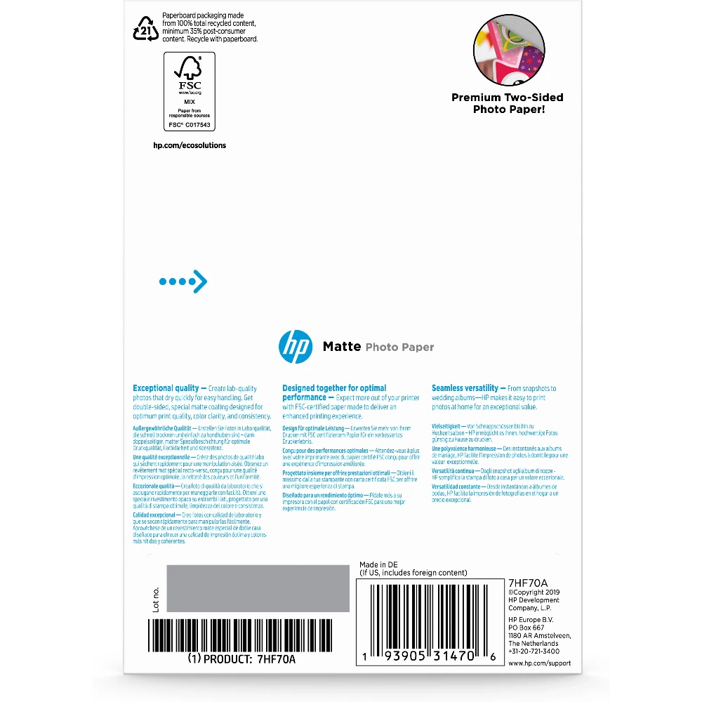 Make two-sided photo projects—like a custom greeting card with a photo on one side and a heartfelt message on the other[1]—with this FSC-certified[3] paper. Your photo projects have a smooth matte finish for reduced glare.