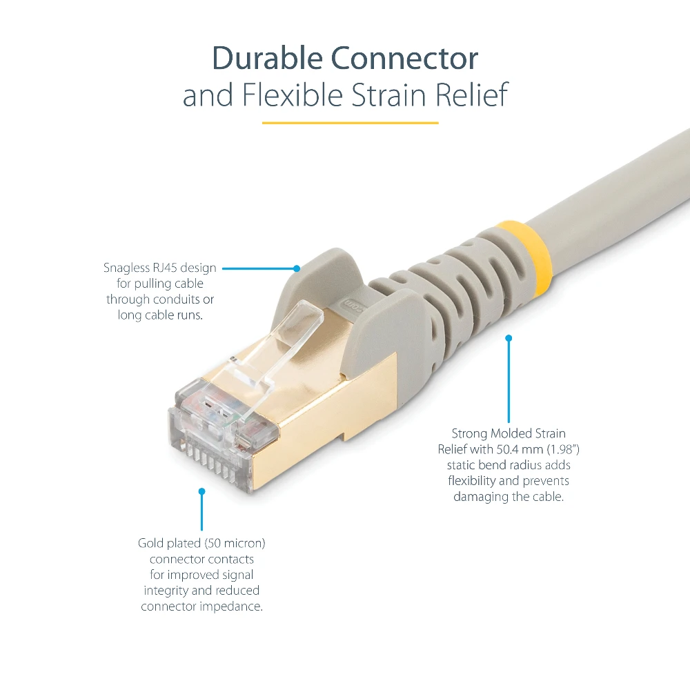 The CAT6a Ethernet cable also features moulded boots which offer strain relief by stopping the RJ45 connectors from bending at sharp angles. This reduces the risk of cable damage, which could decrease network connectivity and performance.
