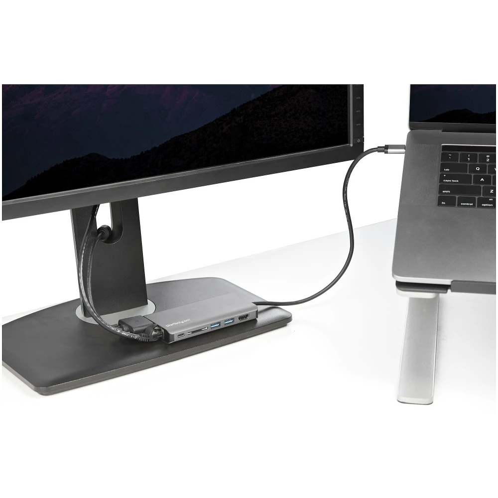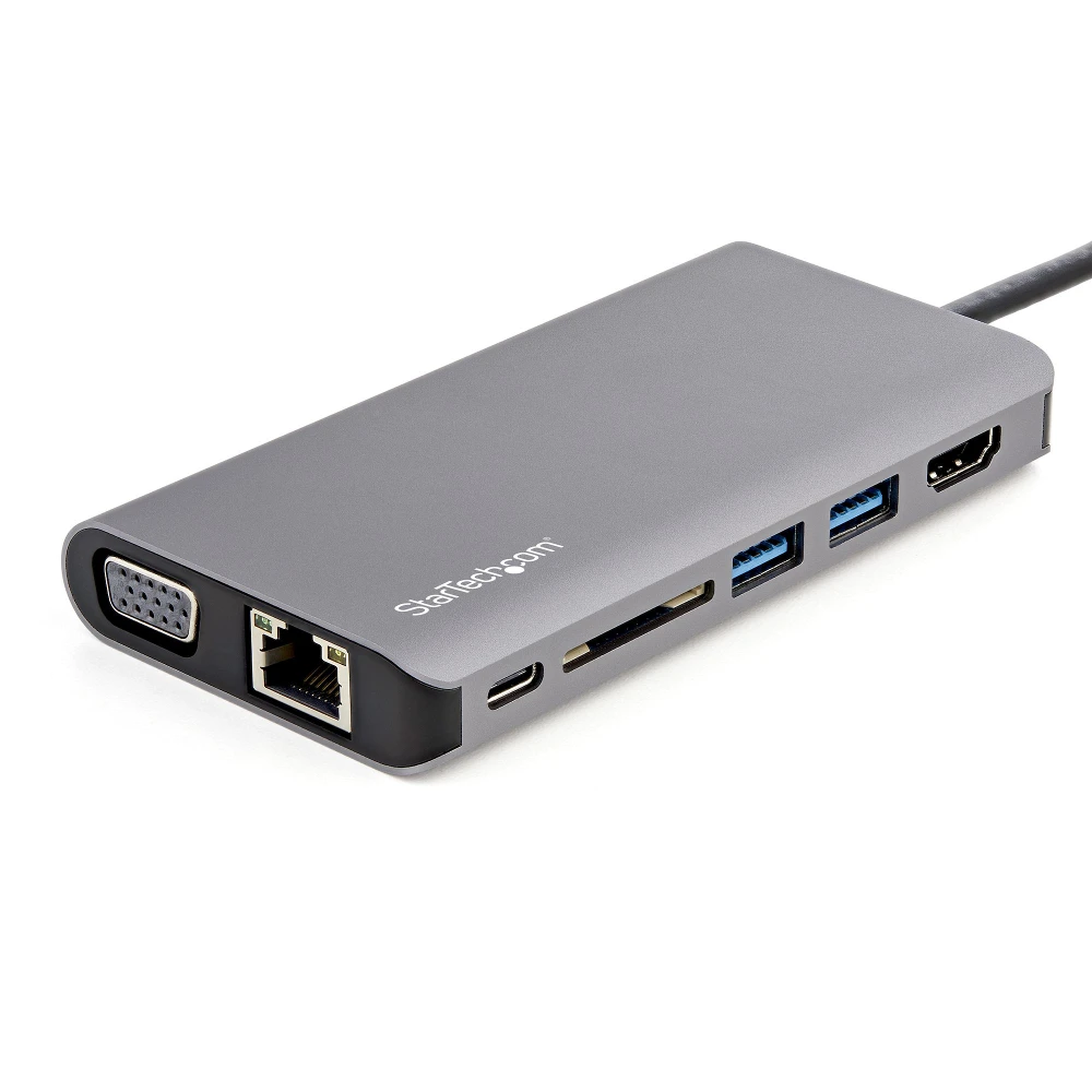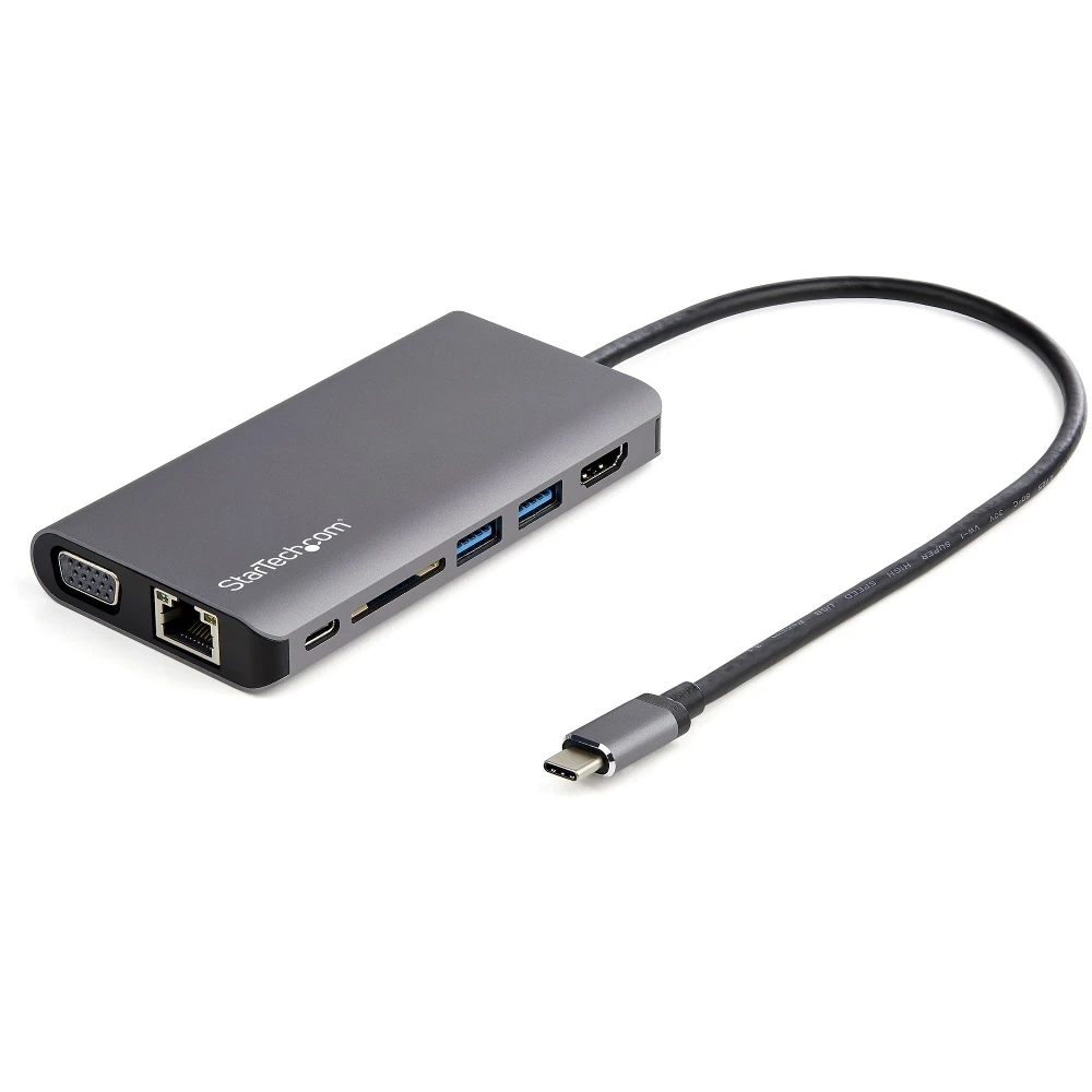 StarTech.com USB C Multiport Adapter - USB-C Mini Travel Dock w/ 4K HDMI or 1080p VGA - 3x USB 3.0 Hub, SD, GbE, Audio, 100W PD Pass-Through - Portable Docking Station for Laptop/Tablet (DKT30CHVAUSP) StarTech.com USB C Multiport Adapter - USB-C Mini Travel Dock w/ 4K HDMI or 1080p VGA - 3x USB 3.0 Hub, SD, GbE, Audio, 100W PD Pass-Through - Portable Docking Station for Laptop/Tablet. Connectivity technology: Wired, Host interface: USB 3.2 Gen 1 (3.1 Gen 1) Type-C, USB Power Delivery up to: 100 W. Ethernet LAN data rates: 10,100,1000 Mbit/s. Product colour: Black, Grey, Compatible memory cards: SD, SDHC, SDXC, Data transfer rate: 5 Gbit/s. Windows operating systems supported: Windows 10, Windows 10 Education, Windows 10 Education x64, Windows 10 Enterprise, Windows 10..., Mac operating systems supported: Mac OS X 10.11 El Capitan, Mac OS X 10.12 Sierra, Mac OS X 10.13 High Sierra, Mac OS X 10.14..., Mobile operating systems supported: Android, iOS. Width: 61 mm, Depth: 460 mm, Height: 15 mm - 8-in-1 usb-c travel dock features 4K 30Hz HDMI or 1080p VGA/2x USB-A 1x USB-C/SD slot/GbE/headset/mic jack - Up to 100W Power Delivery passthrough reserving 15W for usb-c multiport adapter and remainder for laptop - 30cm/1' host cable reduces connector strain on 2-in-1s like Surface Pro 7 iPad Pro HP Elite - Portable usb type-c docking station compatible w/ HP Dell Macbook Chromebook Samsung laptops/tablets/phones - Automatic drivers supports Windows macOS ChromeOS iPadOS Android USB-C Mini Dock | 100W PD Passthrough | USB-C & A Ports | SD Card Reader | Mac, Windows® & ChromeOS | Android OS | GbE