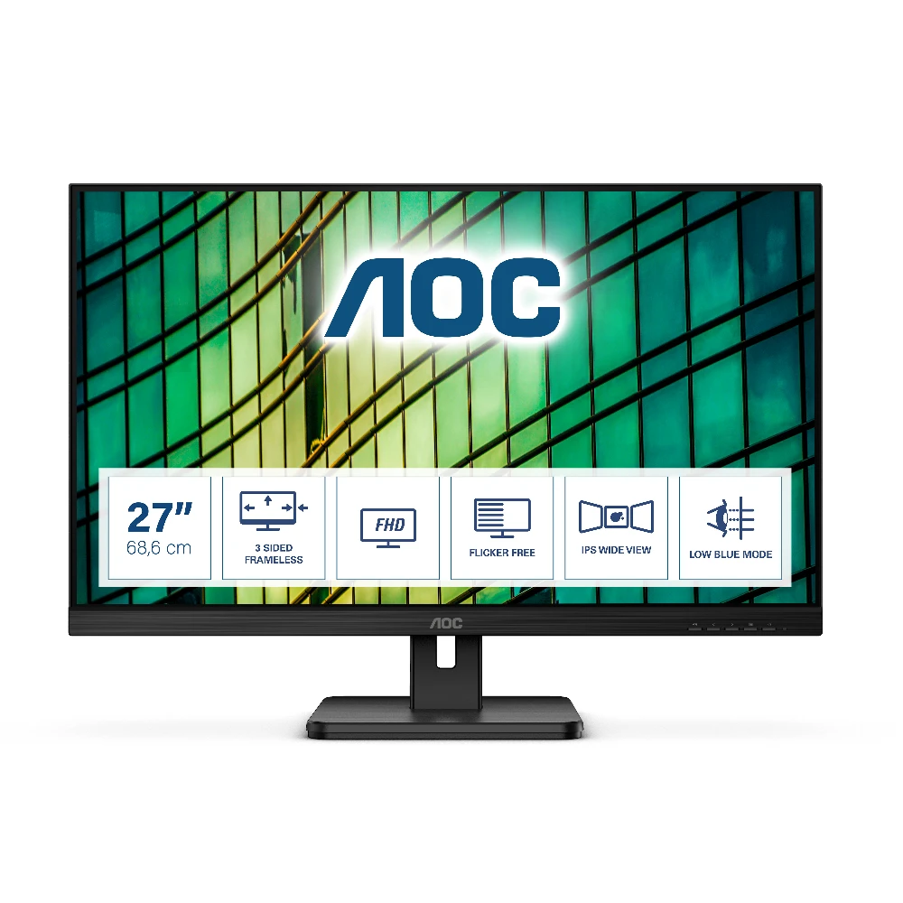AOC E2 27E2QAE. Display diagonal: 68.6 cm (27"), Display resolution: 1920 x 1080 pixels, HD type: Full HD, Display technology: LCD, Response time: 4 ms, Native aspect ratio: 16:9, Viewing angle, horizontal: 178°, Viewing angle, vertical: 178°. Built-in speaker(s). VESA mounting. Product colour: Black