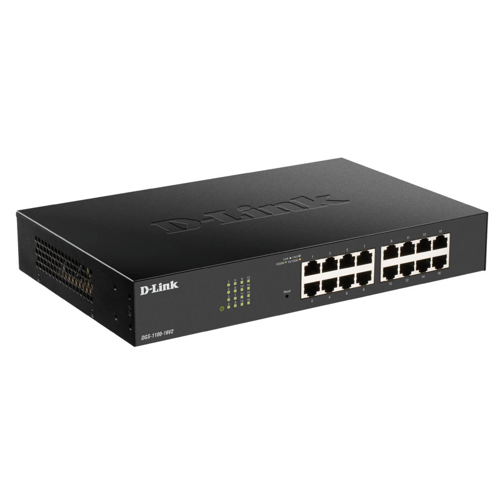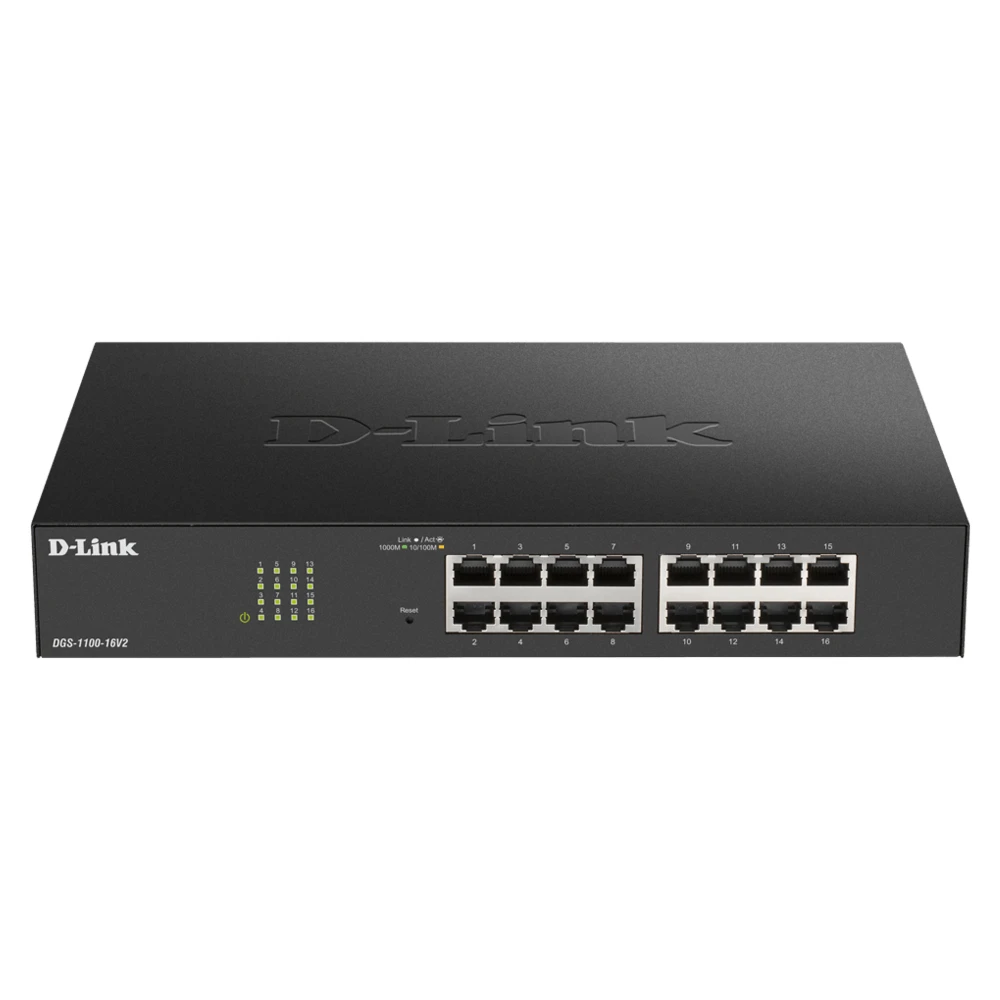 D-Link DGS-1100-16V2. Switch type: Managed, Switch layer: L2. Basic switching RJ-45 Ethernet ports type: Gigabit Ethernet (10/100/1000), Basic switching RJ-45 Ethernet ports quantity: 16. Full duplex. MAC address table: 8000 entries, Switching capacity: 32 Gbit/s. Networking standards: IEEE 802.1AX, IEEE 802.1D, IEEE 802.1Q, IEEE 802.1p, IEEE 802.1w, IEEE 802.3, IEEE 802.3ab, IEEE.... Rack mounting