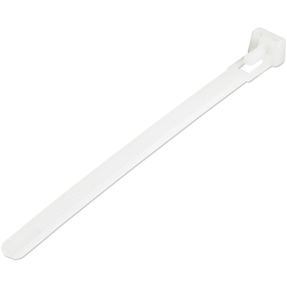 StarTech.com 5"(12cm) Reusable Cable Ties - 1/4"(7mm) wide, 1-1/8"(30mm) Bundle Dia. 50lb(22kg) Tensile Strength, Releasable Nylon Ties, Indoor/Outdoor, 94V-2/UL Listed, 100 Pack - White. Type: Releasable cable tie, Material: Nylon, Plastic, Product colour: White. Length: 8 mm, Width: 125 mm, Height: 1 mm. Quantity per pack: 100 pc(s). Master (outer) case width: 446 mm, Master (outer) case length: 371 mm, Master (outer) case height: 433 mm