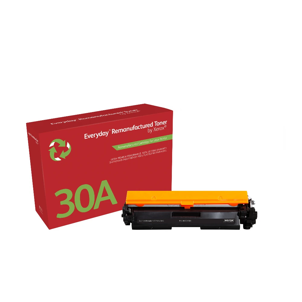 Everyday™ Mono Remanufactured Toner by Xerox compatible with HP 30A (CF230A), Standard capacity Everyday™ Mono Remanufactured Toner by compatible with HP 30A (CF230A), Standard capacity. Black toner page yield: 1600 pages, Printing colours: Black, Quantity per pack: 1 pc(s) Being environmentally responsible is simply the best way to do business, because it positively impacts the health of our planet, your company and your people. Everyday Remanufactured Toner by Xerox has the lowest carbon footprint than any single-use toner cartridge. Because you shouldn't have to choose between doing your part to reduce your eco-impact and your toner costs. And compatibility with the most popular printer brands means you can enjoy benchmark Xerox quality and stewardship no matter what kind of printer you have.