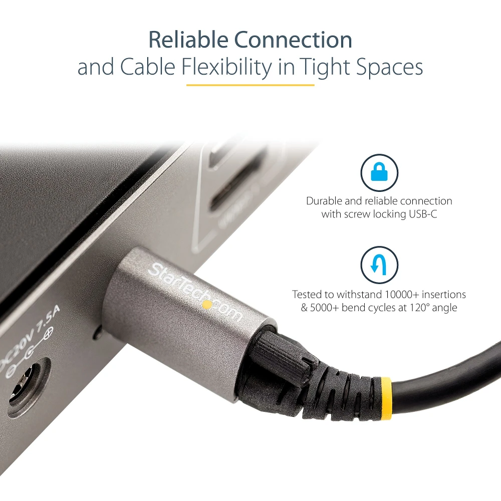 Top Screw Locking USB C Cable 10Gbps | 100W (5A) Power Delivery | DP Alt ModeHigh Performance CableThis top screw locking USB-C 3.2/3.1 Gen 2 10Gbps cable lets you connect your USB Type-C devices for syncing, charging, and powering your devices.The USB-C cable is also compatible with Thunderbolt 3 ports, allowing you to connect and charge your USB-C devices using your Thunderbolt 3 laptop.Reliable Connection with Screw Locking USB-CThis cable features a single locking screw that can securely connect to your USB-C peripherals and can prevent accidental disconnection from your devices such as external hard drives or docking stations.The screw is designed to fit all devices that use a standard top screw locking input, such as StarTech.com's DK31C3HDPD .The knurled screw can easily be removed from the cable completely allowing it to be used as a standard USB-C cable if required.Supports up to 100W (5A) with Power Delivery 3.0With up to 100W (5A) of power delivery, you can power and charge a USB-C laptop, such as your Apple MacBook or Microsoft Surface Book. Simply connect the cable to your USB-C laptop and to a USB-C wall charger.Deliver 8K video with DisplayPort 1.4 Alt ModeThe cable supports 8K 30Hz video with DisplayPort 1.4 and is backward compatible to connect your docking station or laptop to a monitor that supports 4K or 1080p resolutions.Charge your mobile devicesWhen used with devices that support PD 3.0, this cable charges up to 20V and 5A for a maximum of 100W. It can decrease your charge time and make sure your mobile devices are ready, whenever you need them.Quality BuildThis cable is constructed with durable long-lasting, flexible TPE jacket and strain relief. It has been tested to withstand 4000+ bends. It is built with aluminum-mylar foil with 85% braid coverage and EMI shielding for improved signal integrity.The USB31CCTLKV50CM from StarTech.com is backed by a 2-year warranty for guaranteed reliability.The StarTech.com Advantage
