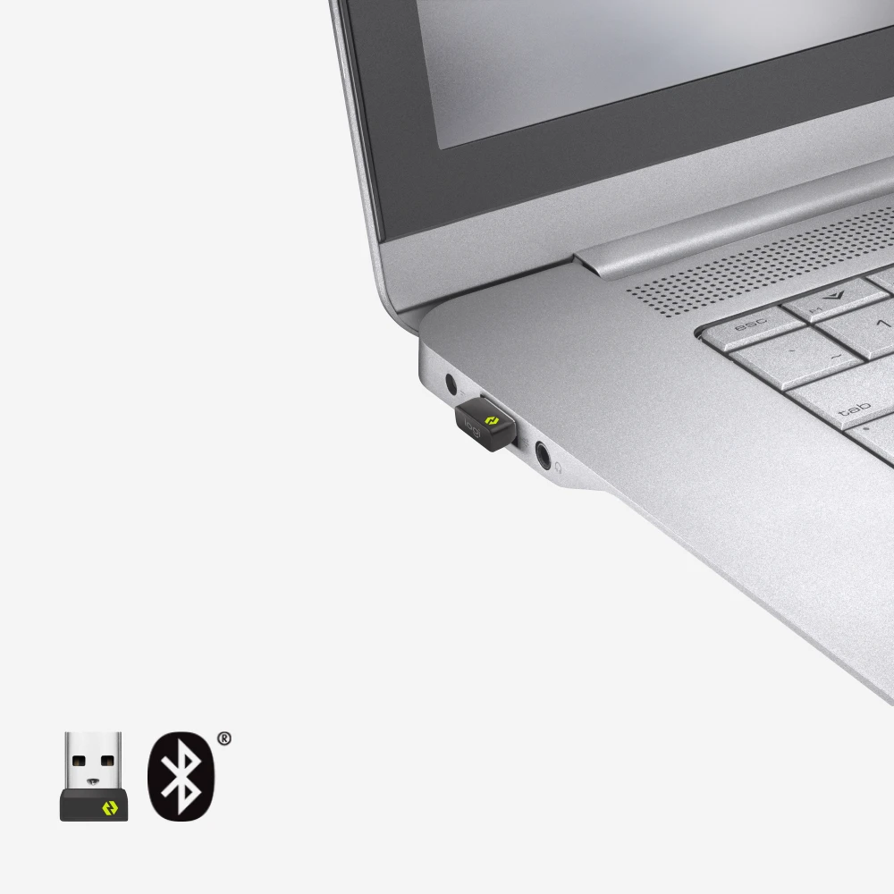 Two connection options: Bluetooth® Low Energy wireless technology or Logi Bolt—a tiny USB receiver designed for security and high performance even in congested wireless environments. Now users have the flexibility to connect how they want while IT ensures those connections are reliable and secure.