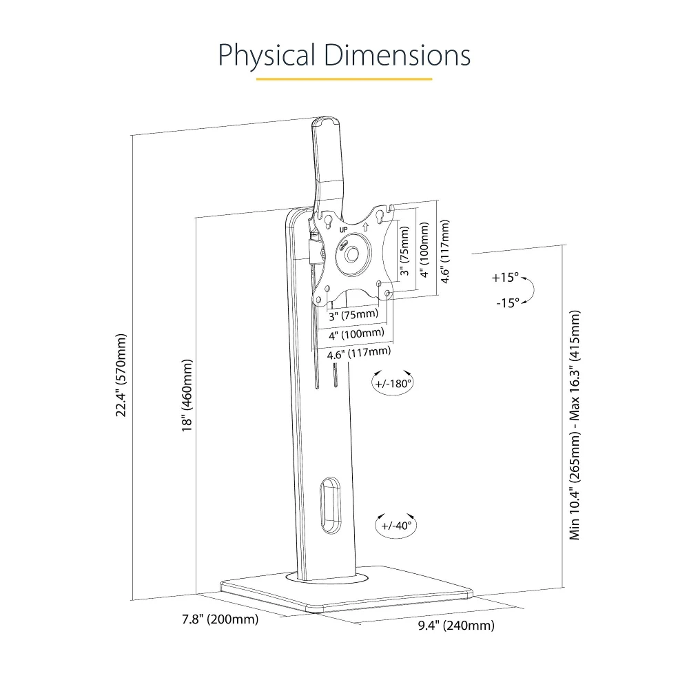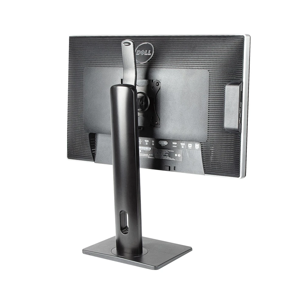 - Free-standing single monitor mount for a display up to 32 inch (15lb) | VESA 75x75/100x100mm | Powder coated black finish - Ergonomic monitor mount +/-15° tilt | +/-180° screen rotation (portrait/landscape) | Swiveling base (+/-40°) - Spring-assisted adjustable height with easy-access lever (10.4"-16.3" range) - Desktop computer monitor stand w/ sturdy and small base (7.8"x9.4") | Ideal for glass top desks or surfaces where monitor mounts cannot be installed - Cable management | Rubber pads