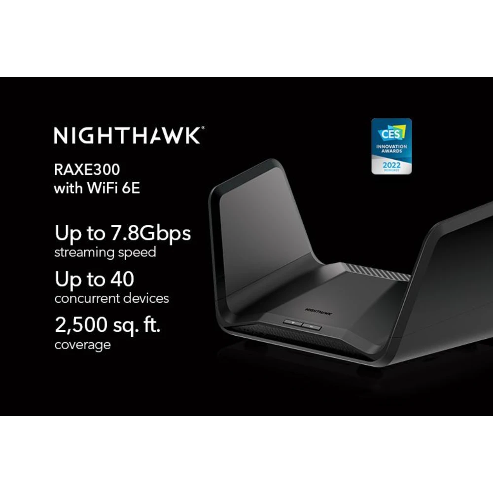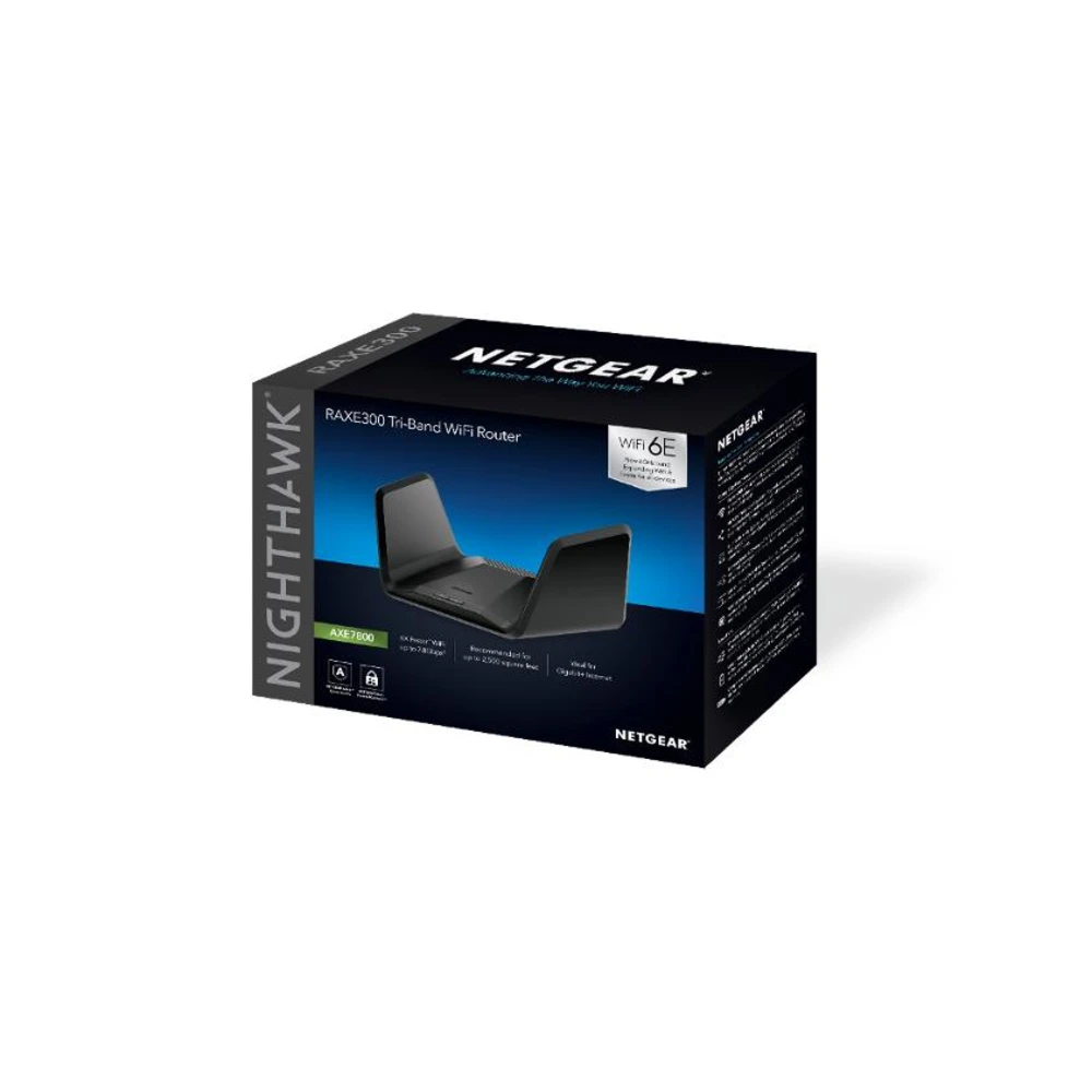 NETGEAR Nighthawk AXE7800 WiFi Router (RAXE300). WAN connection type: RJ-45. Wi-Fi band: Tri-band (2.4 GHz / 5 GHz / 5 GHz), Top Wi-Fi standard: Wi-Fi 6 (802.11ax), WLAN data transfer rate (max): 6600 Mbit/s. Ethernet LAN interface type: Gigabit Ethernet, Ethernet LAN data rates: 10,100,1000 Mbit/s, Networking standards: IEEE 802.11a, IEEE 802.11ac, IEEE 802.11ax, IEEE 802.11b, IEEE 802.11g, IEEE 802.11i, IEEE 802.11n. Security algorithms: 128-bit AES. Product type: Portable router, Product colour: Black, Housing material: Plastic