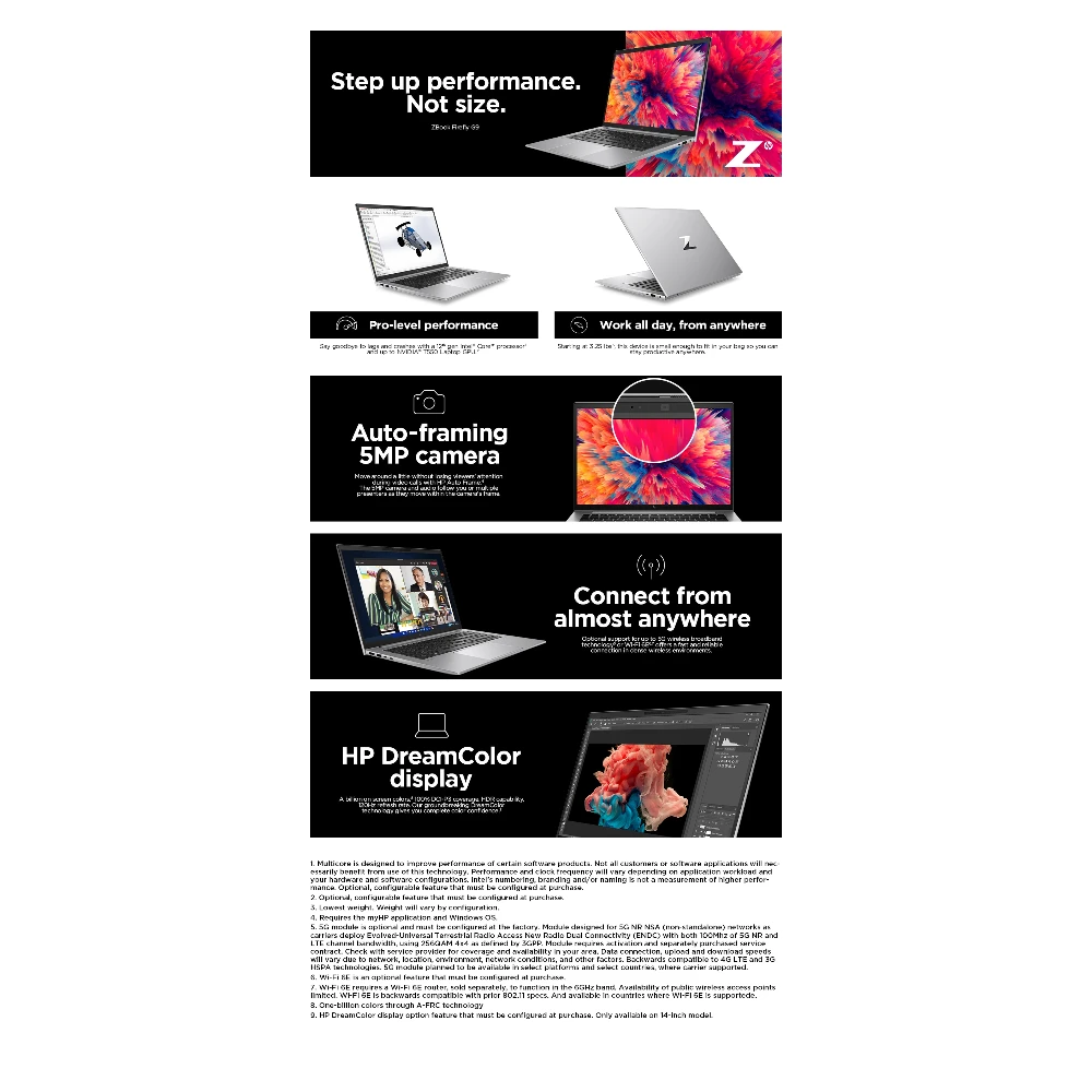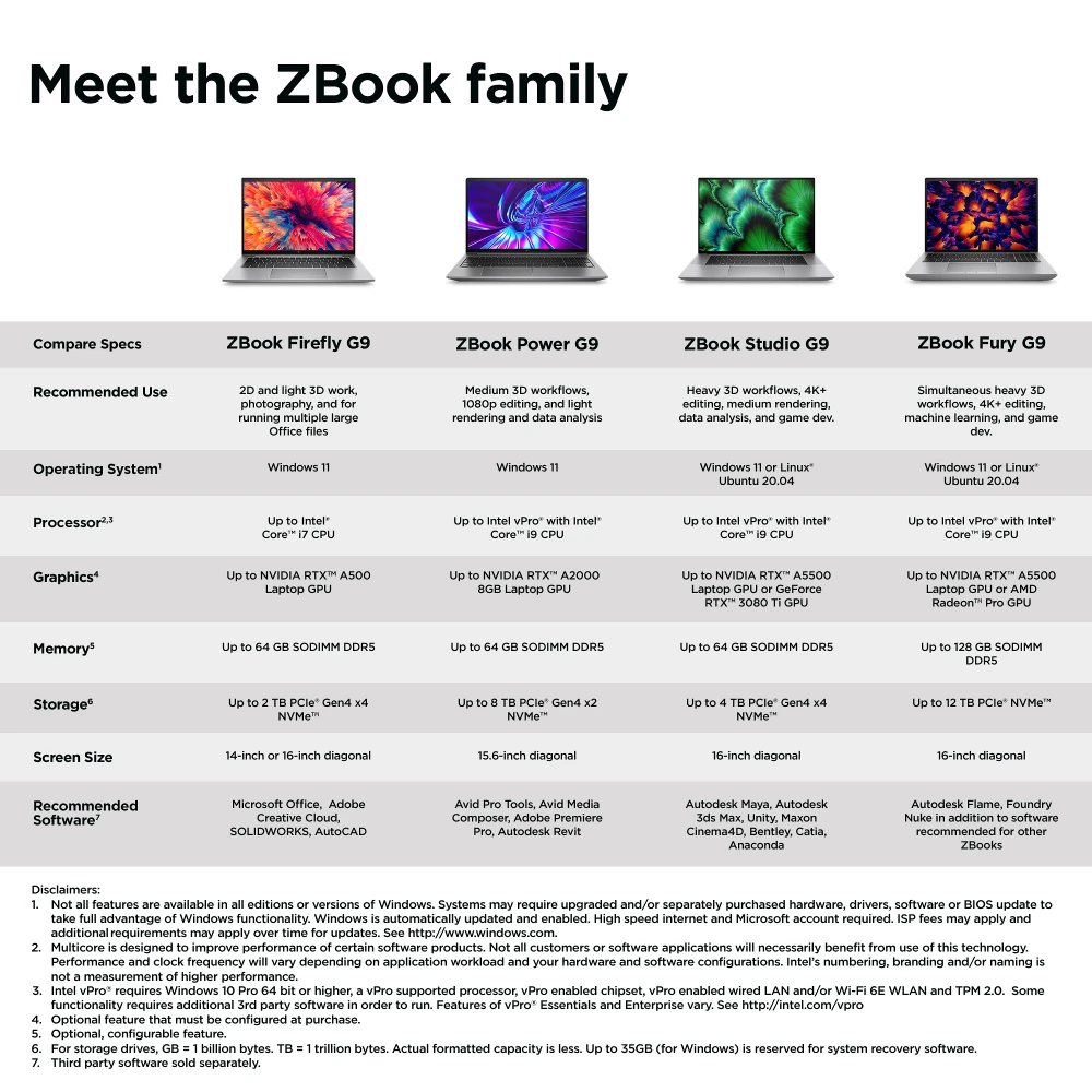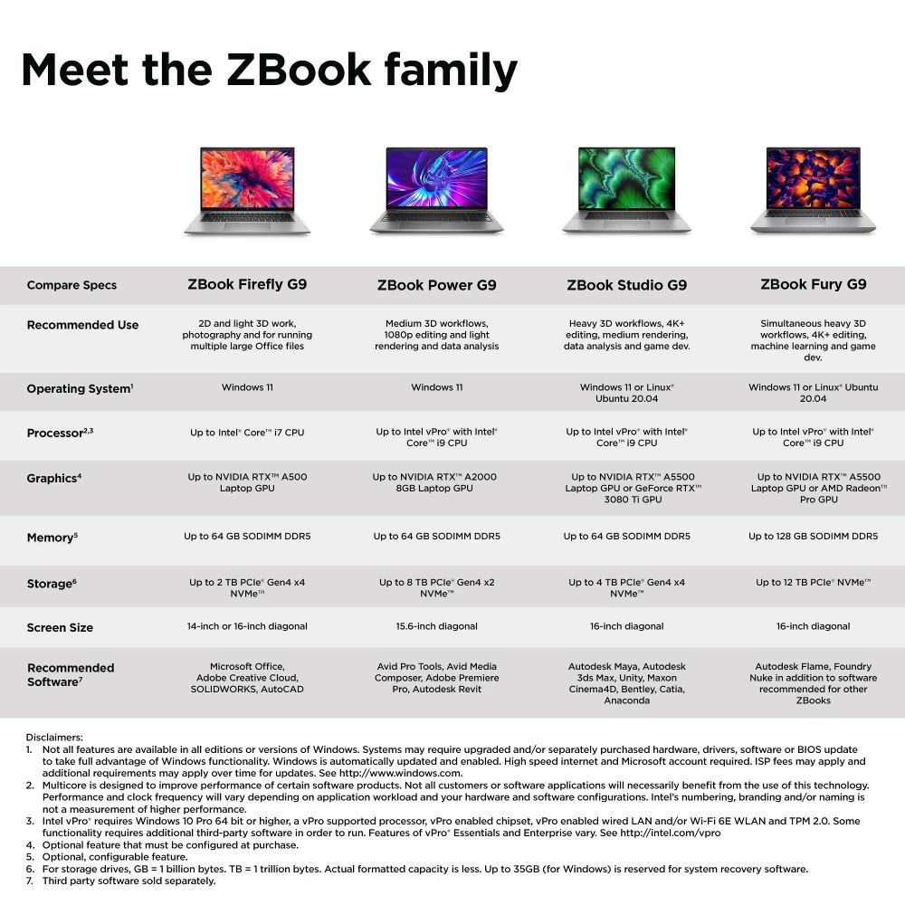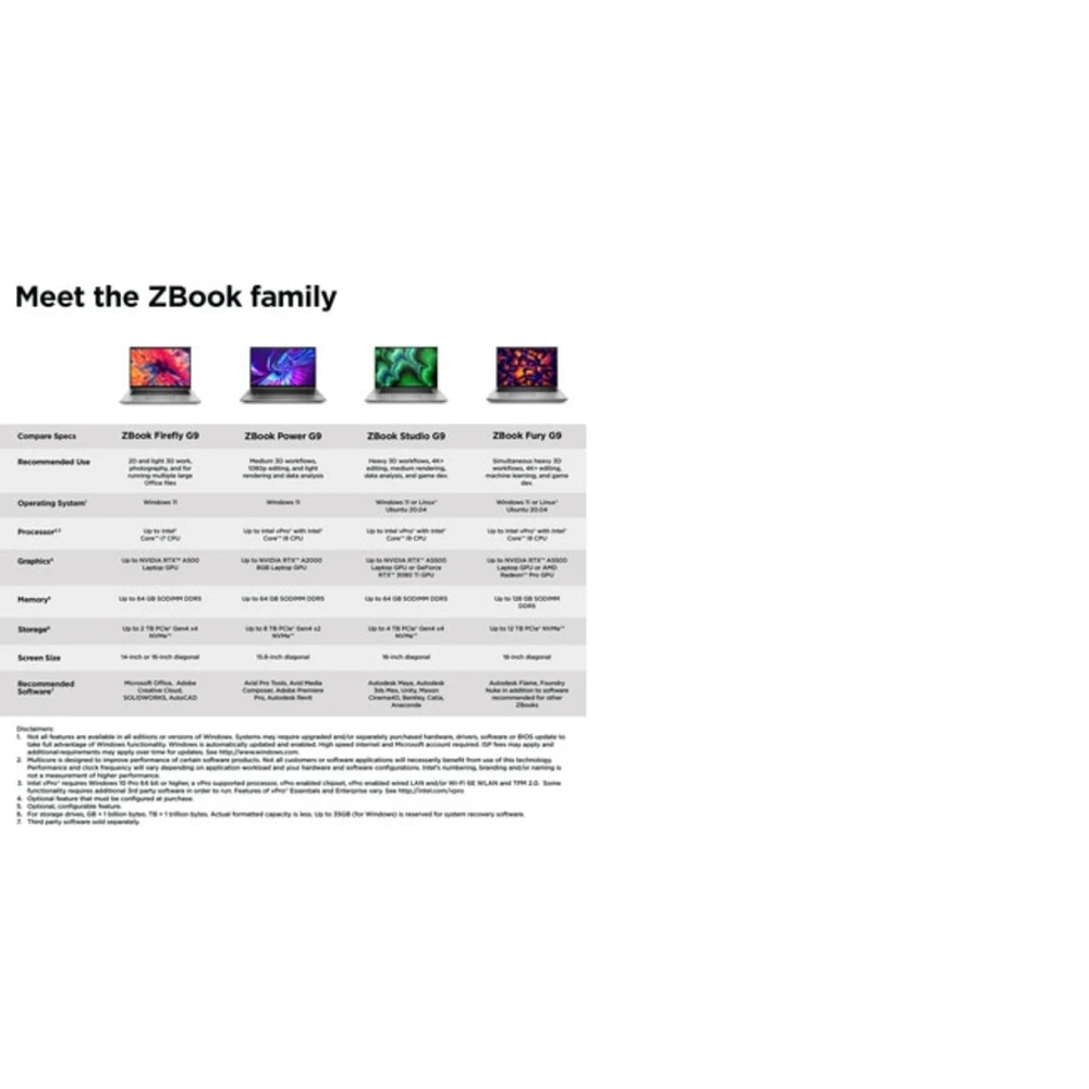 HP ZBook Firefly 16 G9. Product type: Mobile workstation, Form factor: Clamshell. Processor family: Intel? Core? i7, Processor model: i7-1255U. Display diagonal: 40.6 cm (16"), HD type: WUXGA, Display resolution: 1920 x 1200 pixels. Internal memory: 32 GB, Internal memory type: DDR5-SDRAM. Total storage capacity: 1000 GB, Storage media: SSD. On-board graphics card model: Intel? HD Graphics, Discrete graphics card model: NVIDIA Quadro T500. Operating system installed: Windows 11 Pro. Product colour: Silver