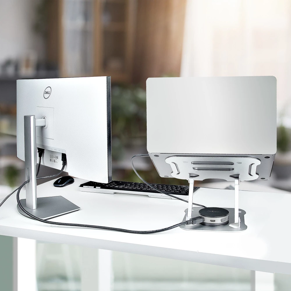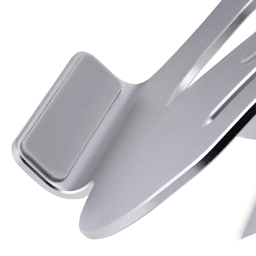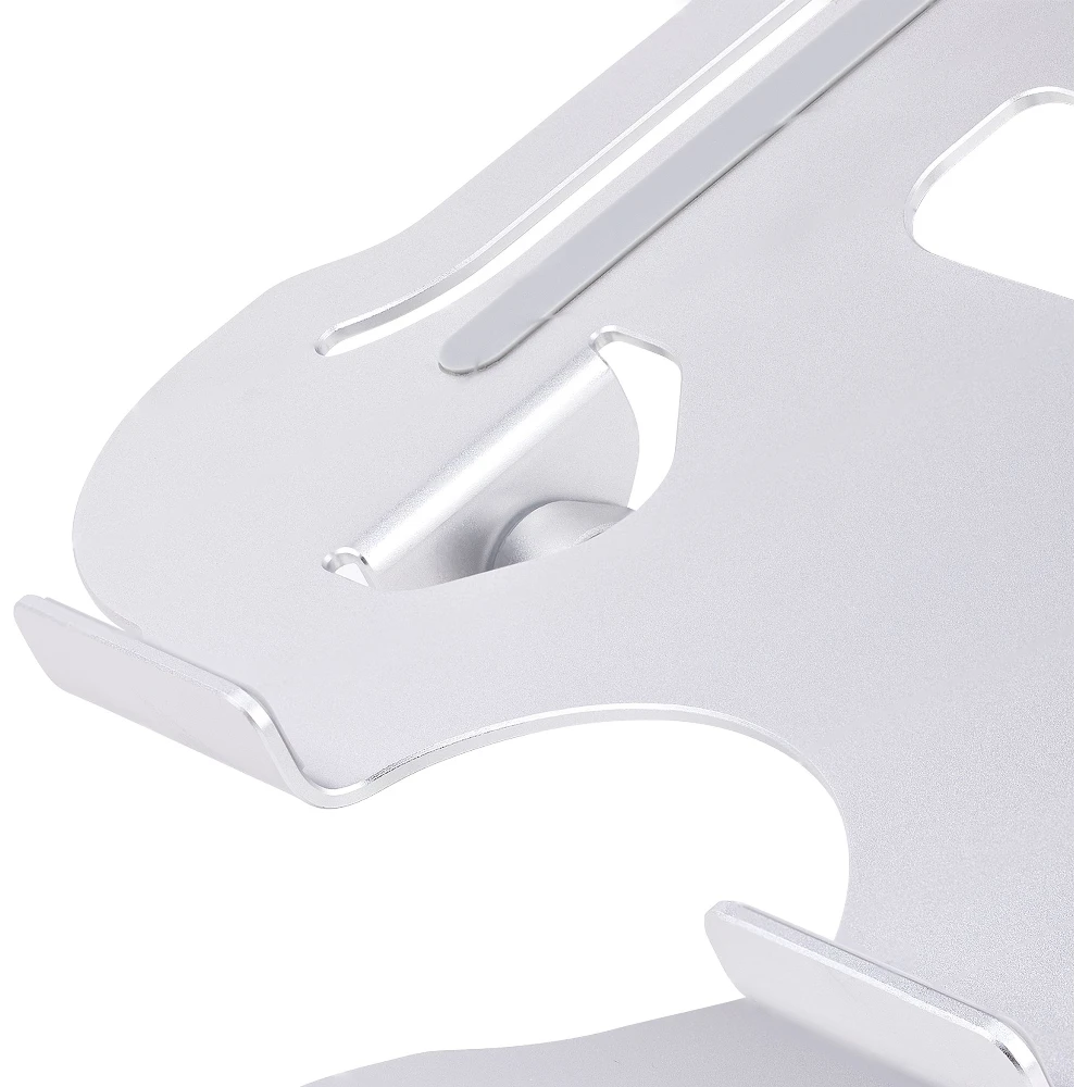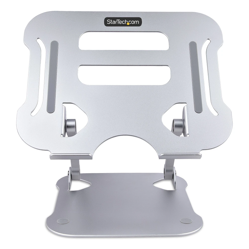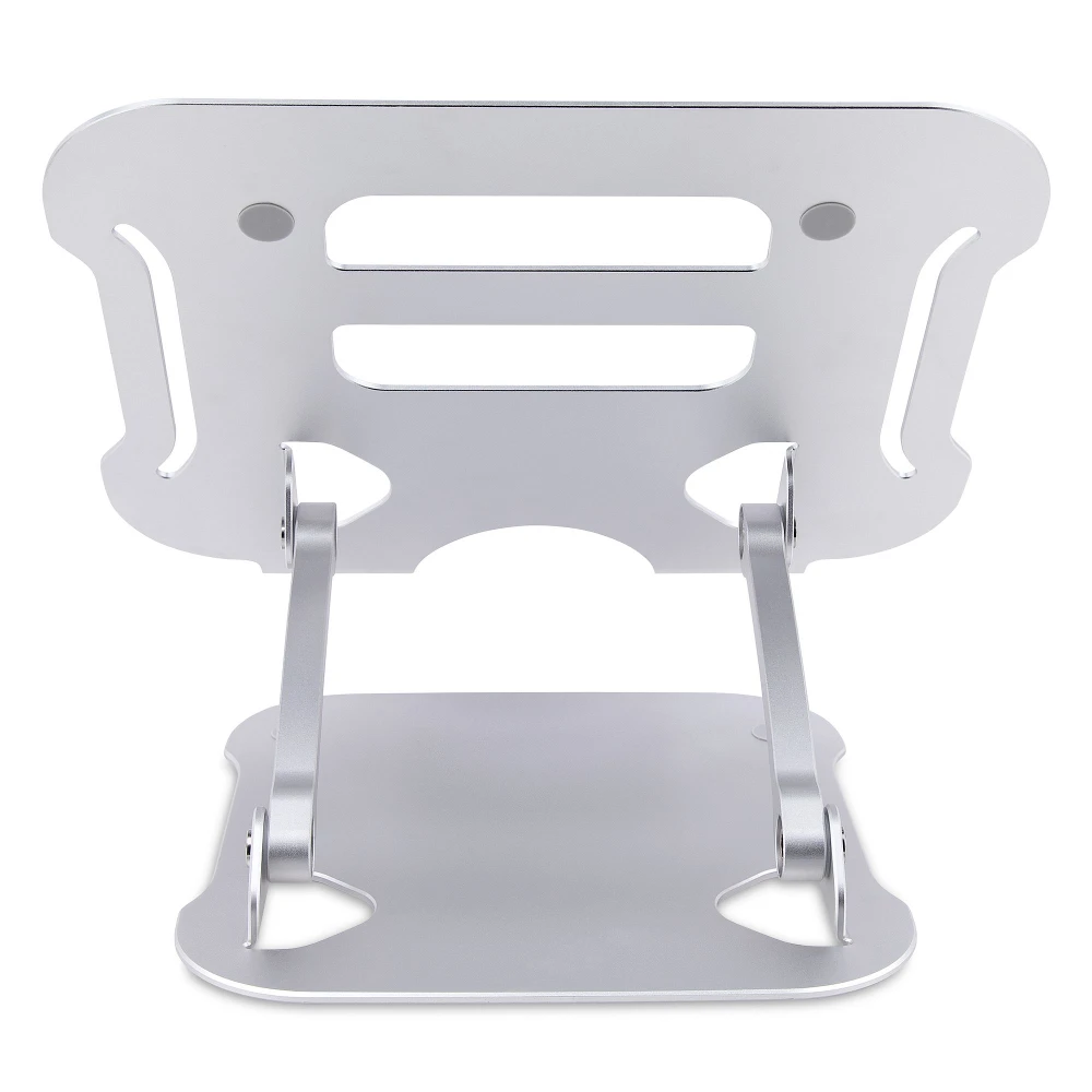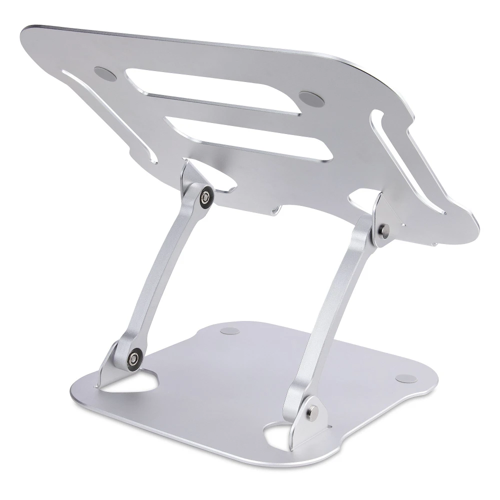 - This silver ergonomic laptop stand for desks tilts and lifts your laptop up to 4.7in (12cm) from the desk surface to eye level for increased comfort and productivity - Height-adjustable 10.6 x 8.9in (26.9 x 22.6cm) surface supports any laptop up to 22lbs (10kg) | Tension can be controlled with included tool - Vented all-aluminum construction improves airflow and heat dissipation, which reduces fan noise and heat stress on laptop hardware -Foldable lightweight design fits in a laptop bag