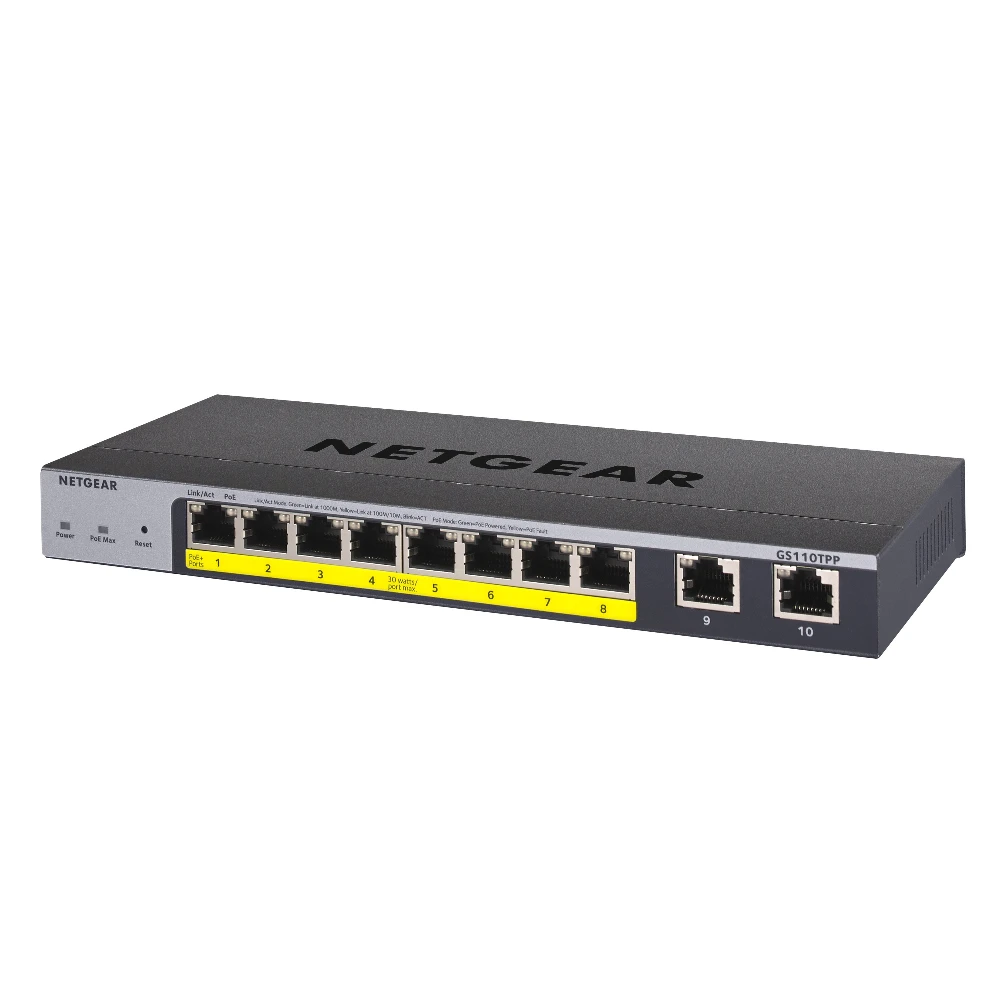 The NETGEAR GS110TPP 8-Port Gigabit PoE+ Ethernet Smart Managed Pro Switch comes with 8 PoE+ copper ports and 2 dedicated Ethernet ports for uplinks. Organizations can now deploy PoE devices with a PoE power budget of 120W. Each PoE+ port can provide up to 30 watts to power up the connected devices. Fanless, the GS110TPP supports perfectly silent desktop operation or wall mounting. The GS110TPP Smart Managed Pro Switch offers an easy-to-use Web browser-based management GUI with configurable L2/L2+ network features like VLANs and PoE operation scheduling, allowing SMB customers to deploy PoE-based VoIP phones and IP surveillance. This switch also comes with NETGEAR Insight Cloud management activation (subscription-based) for anytime remote management and monitoring through an intuitive app or Cloud Portal. Also, its Industry?s first flexible PoE+ integrated technology allows you to increase the PoE budget at any time to provide to your devices the power that they need with interchangeable optional external power adapter and an intuitive power selector.