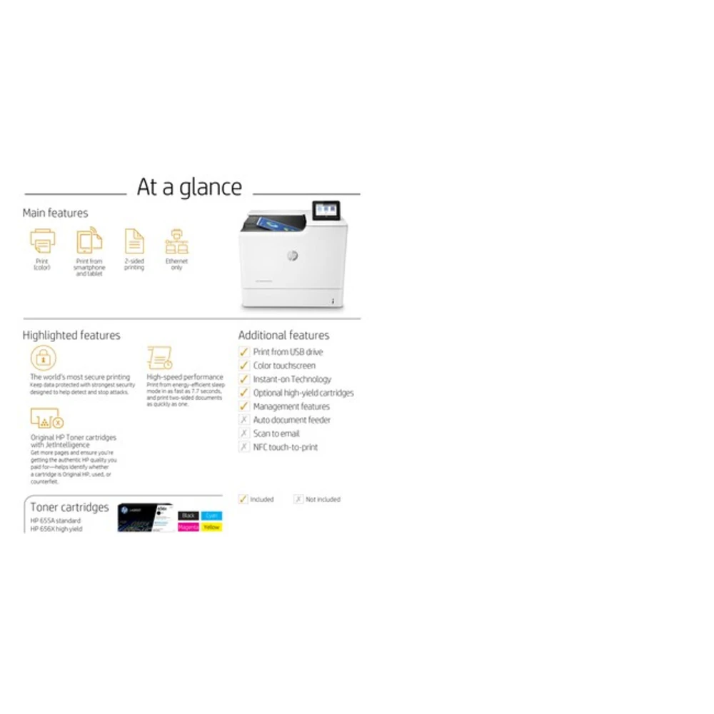HP Color LaserJet Enterprise M653dn, Laser, 56ppm, A4, 1.2MHz, 1024MB, 4.3" CGD This HP Colour LaserJet Printer with JetIntelligence combines exceptional performance and energy efficiency with professional-quality documents right when you need them ? all while protecting your network with the industry's deepest security.[1]