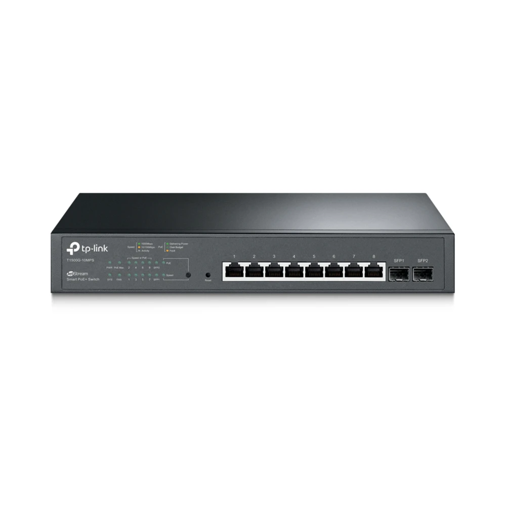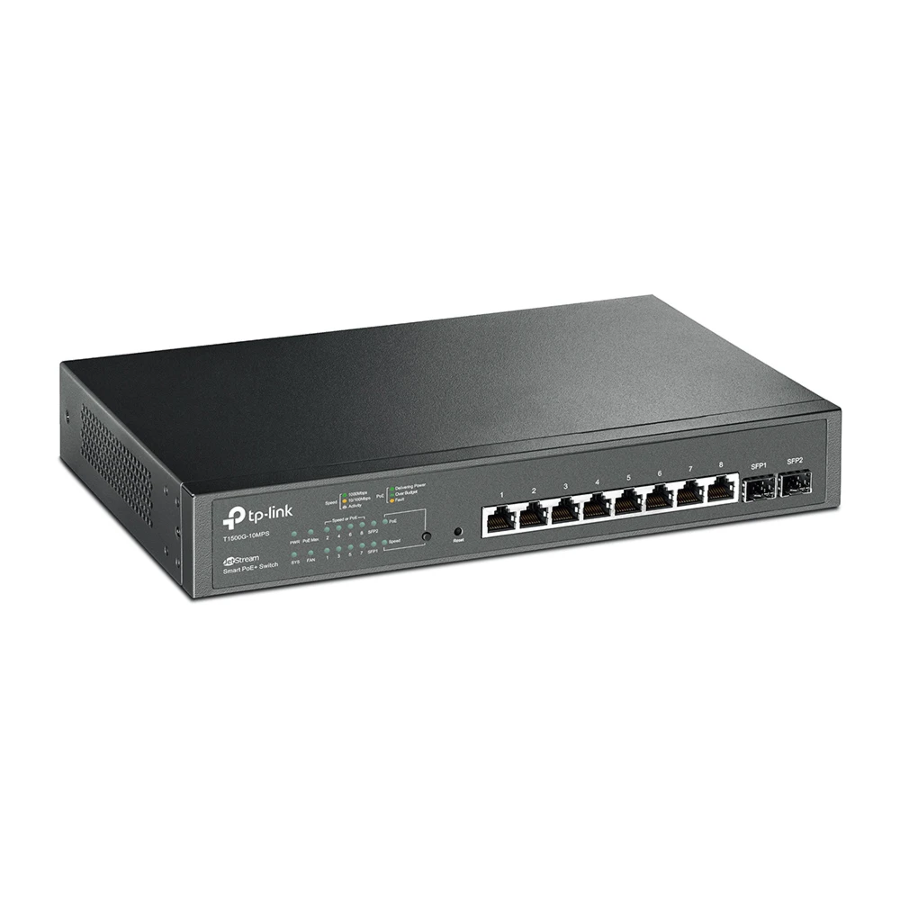 JetStream 8-Port Gigabit Smart PoE+ Switch, w / 2 SFP Slots - Features 8 802.3af/at compliant PoE+ ports, with total PoE power budget of 116W and useful PoE power management features