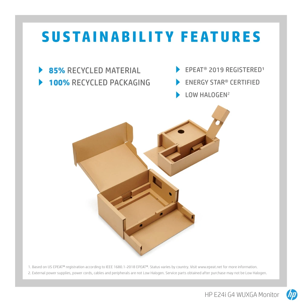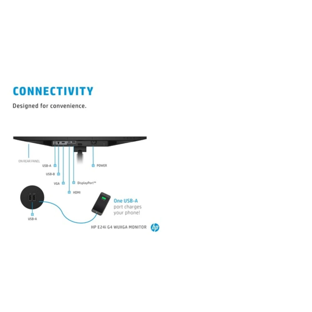 E24i G4 WUXGA Monitor HP E-Series E24i G4. Display diagonal: 61 cm (24"), Display resolution: 1920 x 1200 pixels, HD type: WUXGA, Response time: 5 ms, Native aspect ratio: 16:10, Viewing angle, horizontal: 178?, Viewing angle, vertical: 178?. Built-in USB hub, USB hub version: 3.2 Gen 1 (3.1 Gen 1). VESA mounting, Height adjustment. Product colour: Black, Silver Work comfortably and stay focused on the HP E24i G4 WUXGA Monitor, with HP Eye Ease, optimized ergonomics and WUXGA resolution for you and remote manageability for your IT. Enhance your entire viewing experience