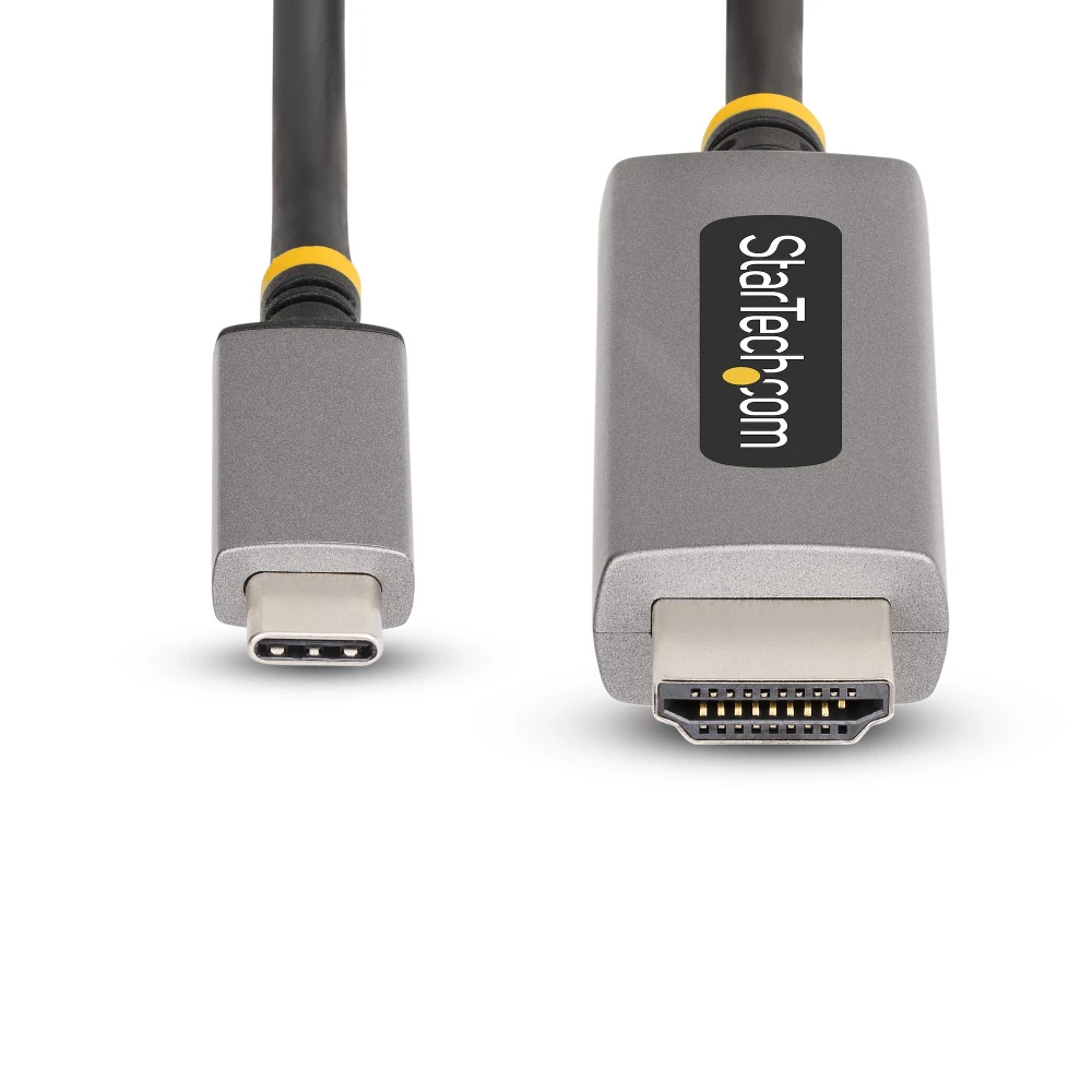 Connect a DP Alt Mode enabled USB-C source to an HDMI monitor, located up to 10ft (3m) away, with support for HDR video and resolutions up to 8K 60HzConnect an 8K 60Hz or a 4K 144Hz HDMI display to a DP Alt Mode-enabled USB Type-C source, at a distance of up to 9.8ft (3m), using this USB-C to HDMI Adapter Cable.High-Resolution HDR VideoThis USB-C to HDMI Cable enables resolutions of up to 8K 60Hz and is HDMI 2.1 FRL complaint. It supports HDR10, HDCP 1.x/2.2/2.3, and DSC 1.1/1.2a. The adapter cable supports 7.1 channel audio with Dolby Atmos and DTS:X.Hardware PlatformSingle MonitorDisplayPort Alt ModeIntel 11 th Gen & Later Processors8K 60Hz or 4K 144Hz*DisplayPort 1.4Nvidia RTX3000 and AMD RX6000 or later8K 60Hz or 4K 144HzDisplayPort 1.4Intel 10th Gen & Earlier4K 60HzDisplayPort 1.4Apple M1/M2 + Pro & Max4K 60Hz**DisplayPort 1.4*DSC support required to reach maximum resolution capabilities on Intel 11th Gen or later**Apple MacBook's with M1/M2 silicon can only support up to 4K 60Hz through HDMIUniversal CompatibilityThe USB-C to HDMI Converter Cable is compatible with laptops and devices from various brands such as Dell, HP, Lenovo, Microsoft, and more. It works with all hardware platforms and any operating system. The USB Type-C to HDMI Cable requires no drivers or software and works with USB-C DP Alt Mode, USB4, Thunderbolt 3, and Thunderbolt 4 laptops and devices.Note: Apple M1/M2 devices, including MacBook Pro, can only support up to 4K 60Hz over USB-C DP Alt Mode and cannot achieve 8K 60Hz.Thoughtfully DesignedCombining a video adapter and cable minimizes potential points of failure and signal loss. Adaptive receiver equalization optimizes the input signal and amplifies the output signal to ensure compatibility with high-resolution monitors. The cable is equipped with cage shielding to prevent Electromagnetic Interference (EMI).The StarTech.com Advantage