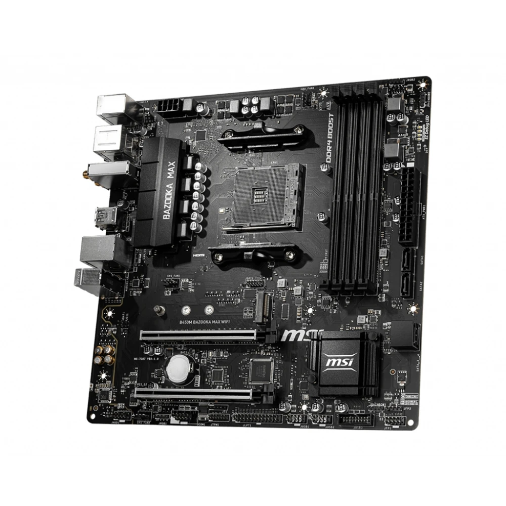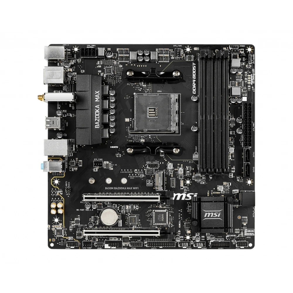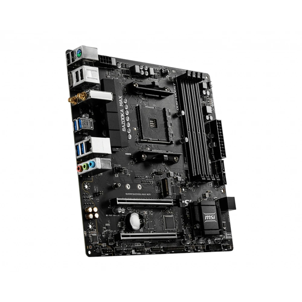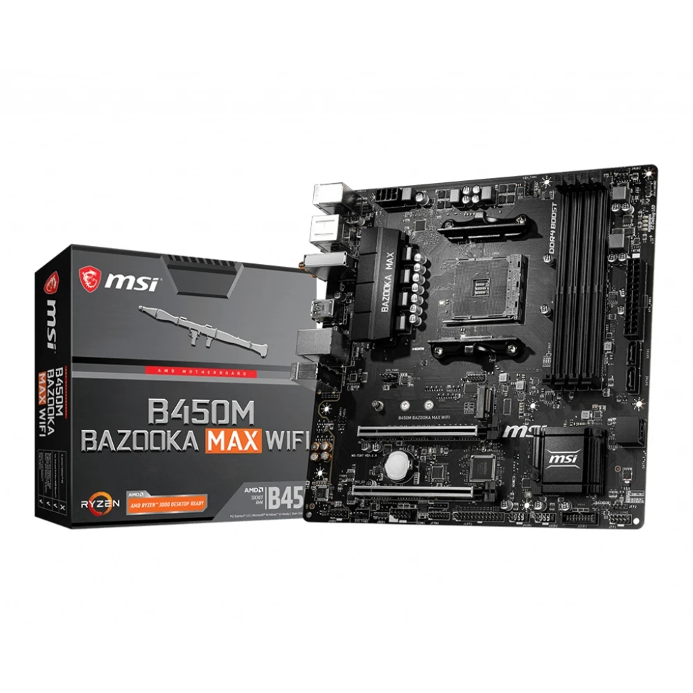 AMD B450 chipset, Socket AM4, 4xDDR4 DIMM slots, 7.1ch audio, LAN, Wi-Fi, Bluetooth MSI B450M BAZOOKA MAX WIFI. Processor manufacturer: AMD, Processor socket: Socket AM4, Compatible processor series: AMD Athlon, AMD Ryzen™ 3, 2nd Generation AMD Ryzen™ 3, 3rd Generation AMD Ryzen™ 3, AMD.... Supported memory types: DDR4-SDRAM, Maximum internal memory: 128 GB, Memory slots type: DIMM. Supported storage drive interfaces: M.2, SATA III, Supported storage drive types: HDD & SSD, RAID levels: 0, 1, 10. Parallel processing technology support: 2-Way CrossFireX, Maximum graphics card memory: 2048 MB, Maximum resolution: 3840 x 2160 pixels. USB connector type: USB Type-A DIY FRIENDLY