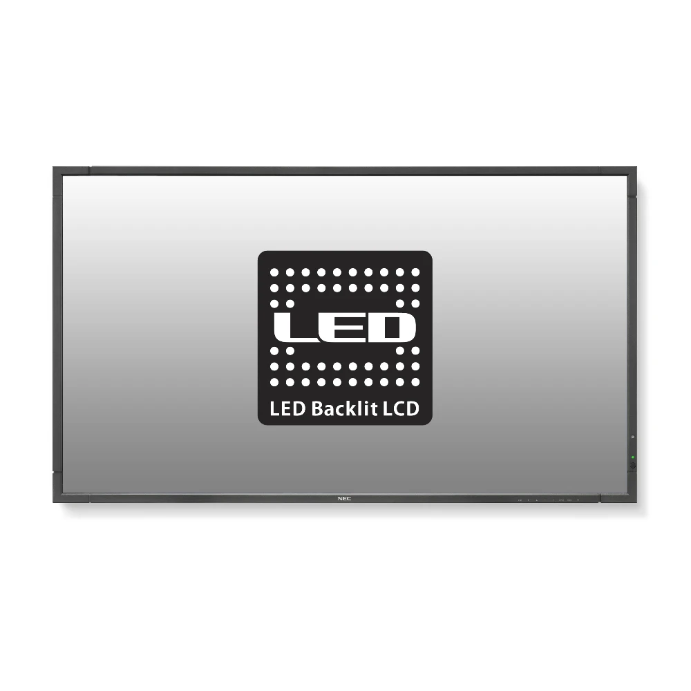 80" UV² A Edge LED, 1920x1080, 350 cd/m², 5000:1, 4 ms, VGA, DisplayPort, HDMI, DVI-D, LAN NEC MultiSync E805. Product design: Digital signage flat panel. Display diagonal: 2.03 m (80"), Display technology: LED, Display resolution: 1920 x 1080 pixels, Display brightness: 400 cd/m², HD type: Full HD. Operating hours (hours/days): 12/7. Product colour: Black The NEC MultiSync® E805 succeeds in balancing impressive visual performance with a budget-oriented large format presentation without compromise. The 80 inch (203cm) LCD-panel features a detail-rich FullHD resolution, eye-pleasing black levels for ergonomic viewing and state-of-the-art connectivity optimized to the needs of corporate applications. Thanks to an integrated ambient light sensor and latest LED backlight technology, the model features an amazingly low TCO with maintenance-free operation.