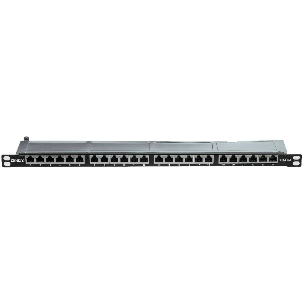 Lindy 25884. Cabling technology: 10Base-T, Ethernet interface type: 10 Gigabit Ethernet, Connector(s): RJ-45. Product colour: Black, Material: Metal, Mounting: Rack mounting. Width: 480 mm, Height: 22 mm, Depth: 100 mm