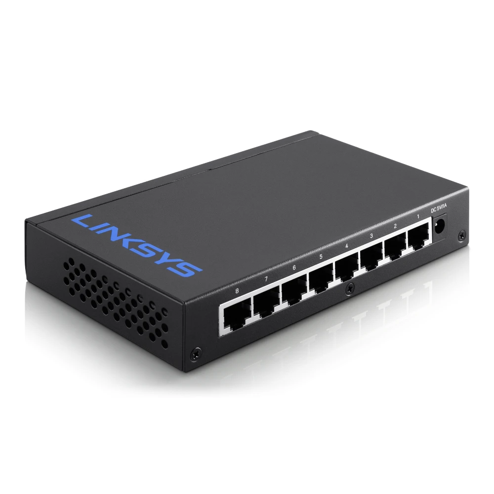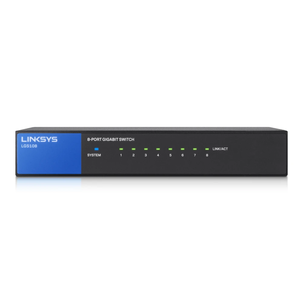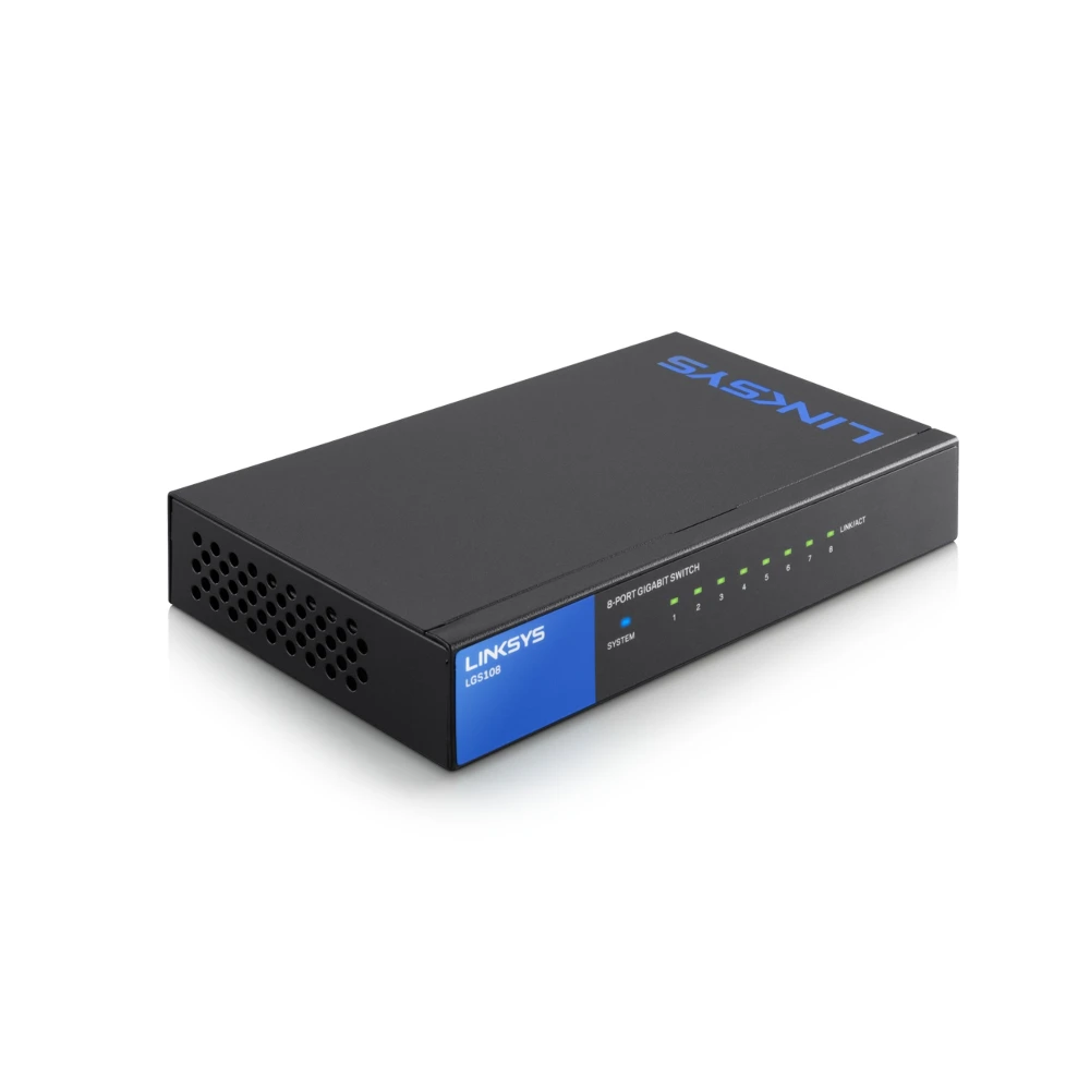 8 x RJ-45, Gigabit Ethernet, IEEE 802.3 u/x/ab/az Linksys 8-Port Desktop Gigabit Switch (LGS108). Switch type: Unmanaged. Basic switching RJ-45 Ethernet ports type: Gigabit Ethernet (10/100/1000), Basic switching RJ-45 Ethernet ports quantity: 8. MAC address table: 8000 entries, Switching capacity: 16 Gbit/s. Networking standards: IEEE 802.3, IEEE 802.3ab, IEEE 802.3az, IEEE 802.3u, IEEE 802.3x. Wall mountable Upgrade the data paths of your local wired network to information superhighways with Gigabit switches at the desktop. Accelerate your performance and productivity when you send large files to network servers, drives, and printers at Gigabit speed.