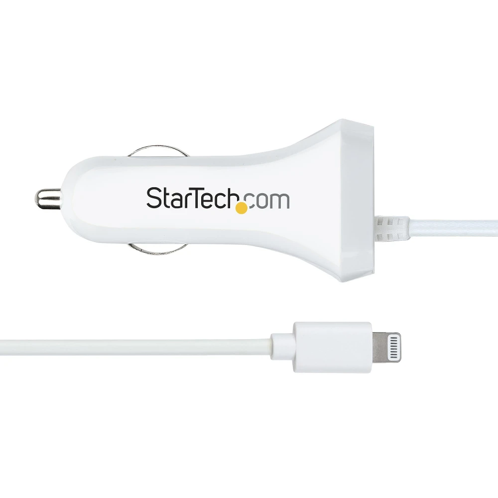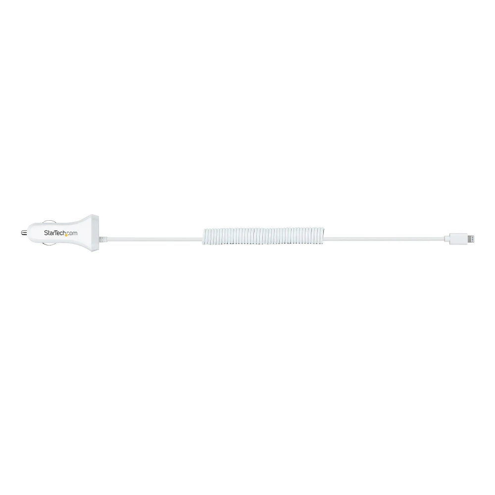 Lightning Car Charger w/ Coiled Cable, 1m, White, USB Car ChargerDo you carpool to work and need to flip a coin to see who will get to charge their tablet on the way to the office? Do you need to charge your tablet and phone at the same time, so that they're both ready to use by the time you reach your destination?Whatever your situation, this dual-port car charger offers a high-powered solution for charging two mobile devices simultaneously, while you're on the road.Simultaneous ChargingCharge any Lightning mobile device, including your iPad or iPhone, using this convenient 2 port USB adapter. Reduce tangles and keep your vehicle tidy with the built-in coiled Lightning USB cable.Along with the Apple device, you can also charge USB-C or Micro-USB mobile devices, such as an Android smartphone, Samsung tablet, or GPS, using an appropriate cable (Lightning cable included. All other cables are sold separately).High-Powered ChargingEach charge port provides 2.1A of power to assure that you have enough power to charge everything from a phone to a tablet. Whether you're charging two tablets at the same time, or charging a phone and a tablet, you can be sure that all your mobile devices are ready when you needed.USBLT2PCARW2 is backed for 2-years by StarTech.com, including free 24/5 multi-lingual technical assistanceThe StarTech.com Advantage
