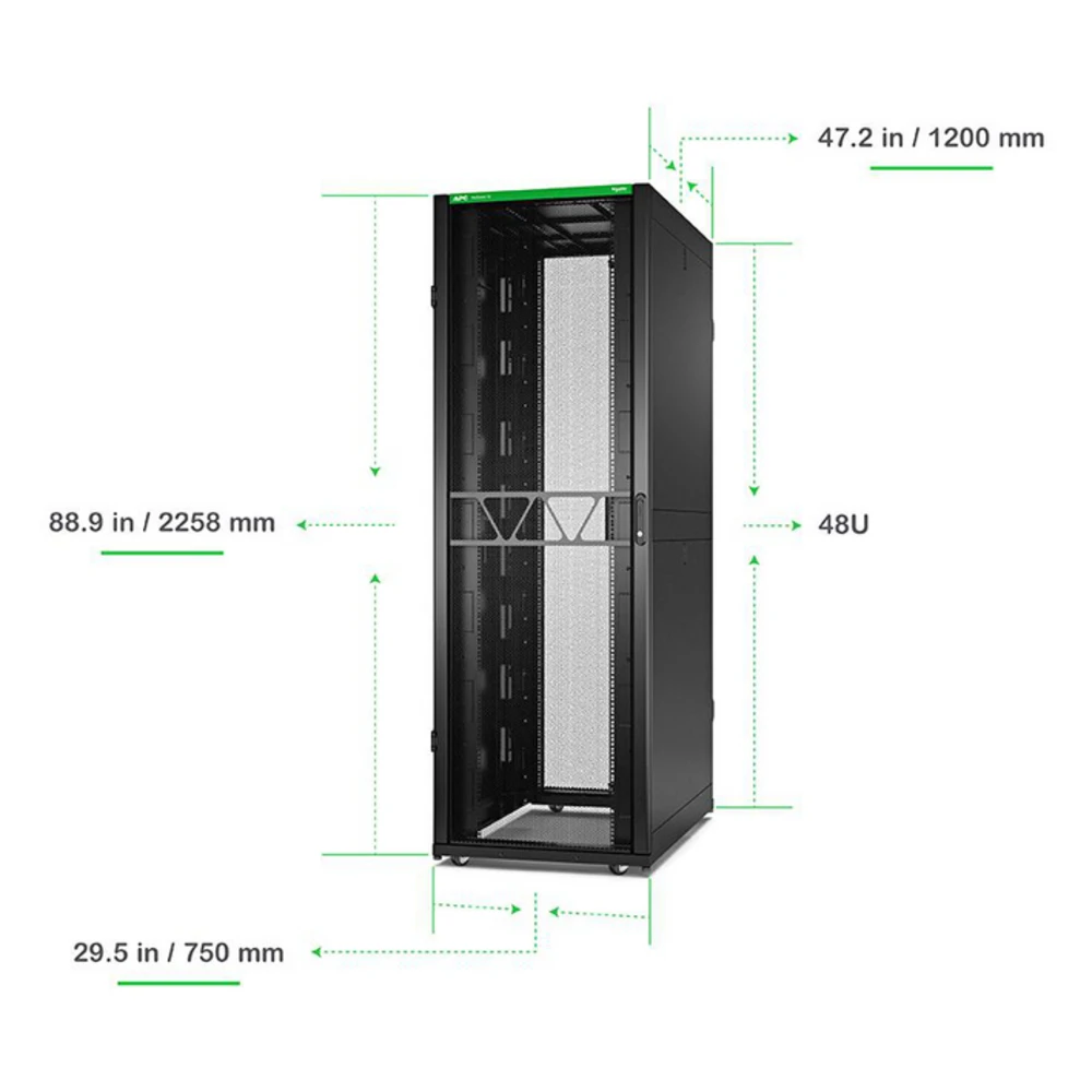 APC NetShelter SX Server Rack Gen 2, 48U, 2258H x 750W x 1200D mm, with Sides, Black. Type: Freestanding rack, Rack capacity: 48U, Maximum weight capacity: 1814 kg, Key lock, Adjustable feet. Weight: 177.8 kg. Product colour: Black