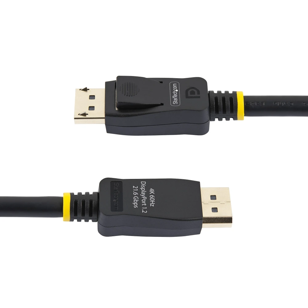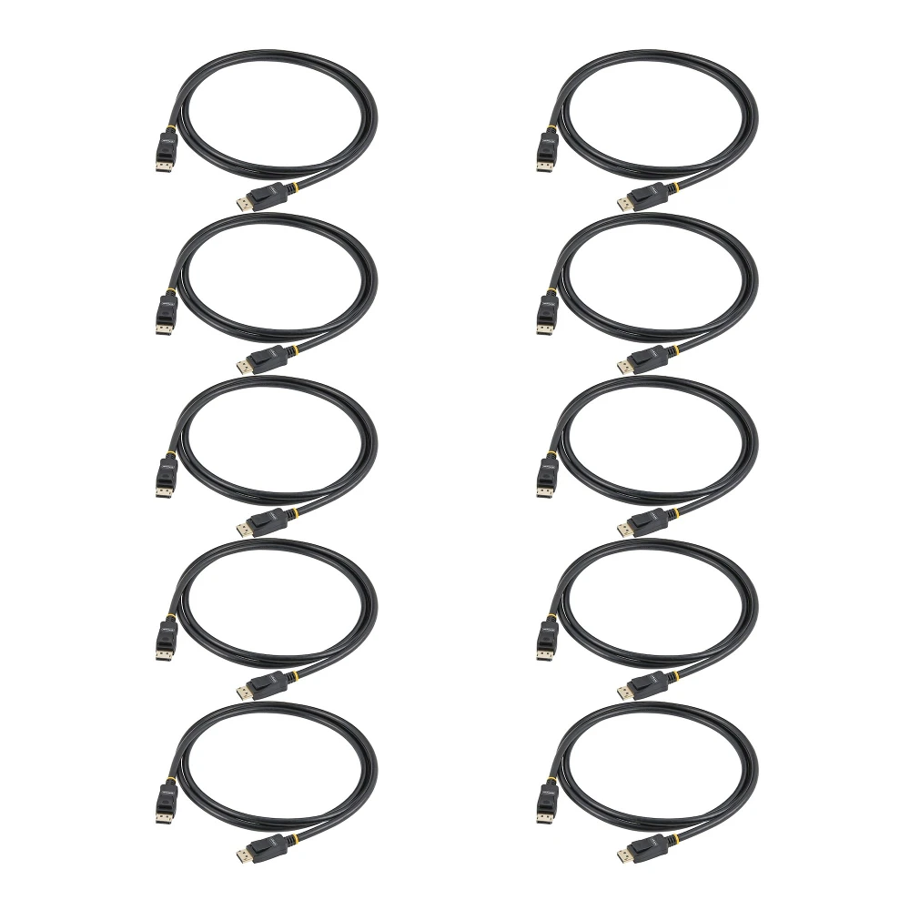 StarTech.com 2m (6.6ft) VESA Certified DisplayPort Cable - 10 Pack - DisplayPort 1.2 Cable/Cord, 4K60Hz, Latching DP Connectors StarTech.com 2m (6.6ft) VESA Certified DisplayPort Cable - 10 Pack - DisplayPort 1.2 Cord with Latches, 4K 60Hz UHD, DP to DP Cable for Monitor, Latching DP Connectors. Cable length: 2 m, Connector 1: DisplayPort, Connector 2: DisplayPort. Compliance certificates: CE, RoHS. Cable diameter: 7.3 mm, Weight: 134 g. Package width: 350 mm, Package depth: 460 mm, Package height: 100 mm. Quantity per pack: 10 pc(s) 2m VESA Certified DisplayPort v1.2 cable supports 4K 60Hz w/HBR2/8Ch Audio/MST/GTC/3D Stereo; Practical 10 Pack is ideal for multiple deployments - Durable 28AWG cable w/flexible TPE jacket and strain reliefs prevents damage due to bends/rough use; Latching DP connectors prevent accidental disconnection - For home/office/boardroom/classroom use w/ laptop/workstation and UHD monitor/projector/large display; Samsung/Sony/Dell - Supports DP1.2 and earlier versions Set up multiple 4K UHD connections using this DisplayPort Cable 10 Pack