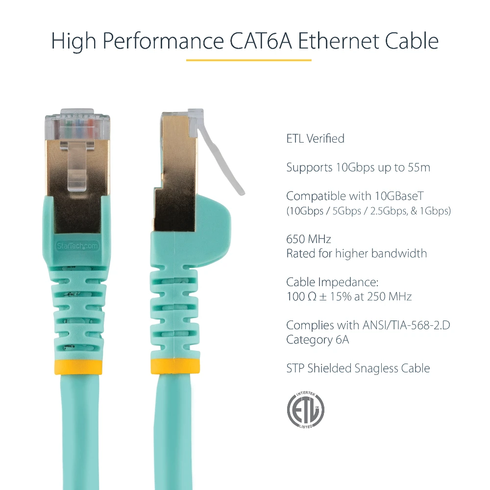 - 2 m Aqua CAT6a Ethernet cable w/ 100% copper delivers 10 gigabit network connection|Fluke tested to comply w/ ANSI/TIA-568-D Category 6 requirements - Shielded pairs protect against crosstalk noise and electromagnetic interference - 26 AWG stranded copper conductors|Up to 100W for PoE applications|Built w/ ETL and UL verified wire (E132276-A) - 50-micron gold-plated RJ45 connectors provide clear signals stop rust/corrosion - Snagless connector patch cord easily pulls through wiring conduits