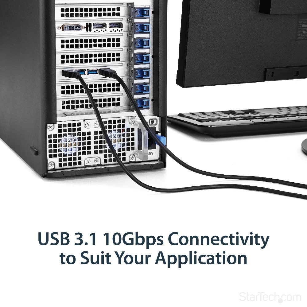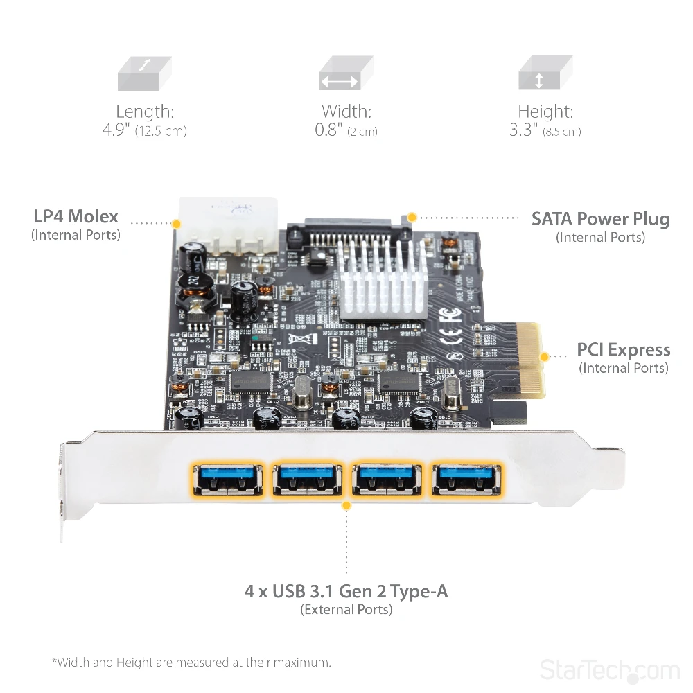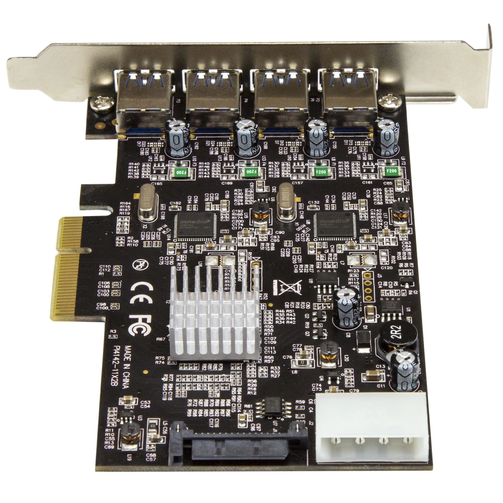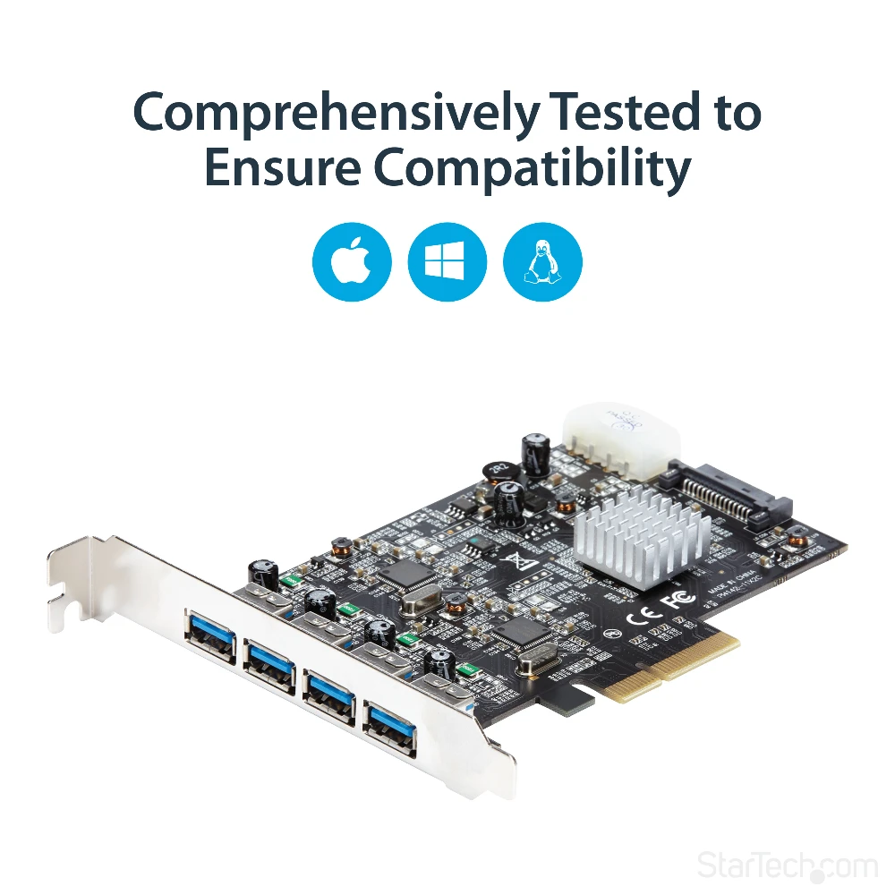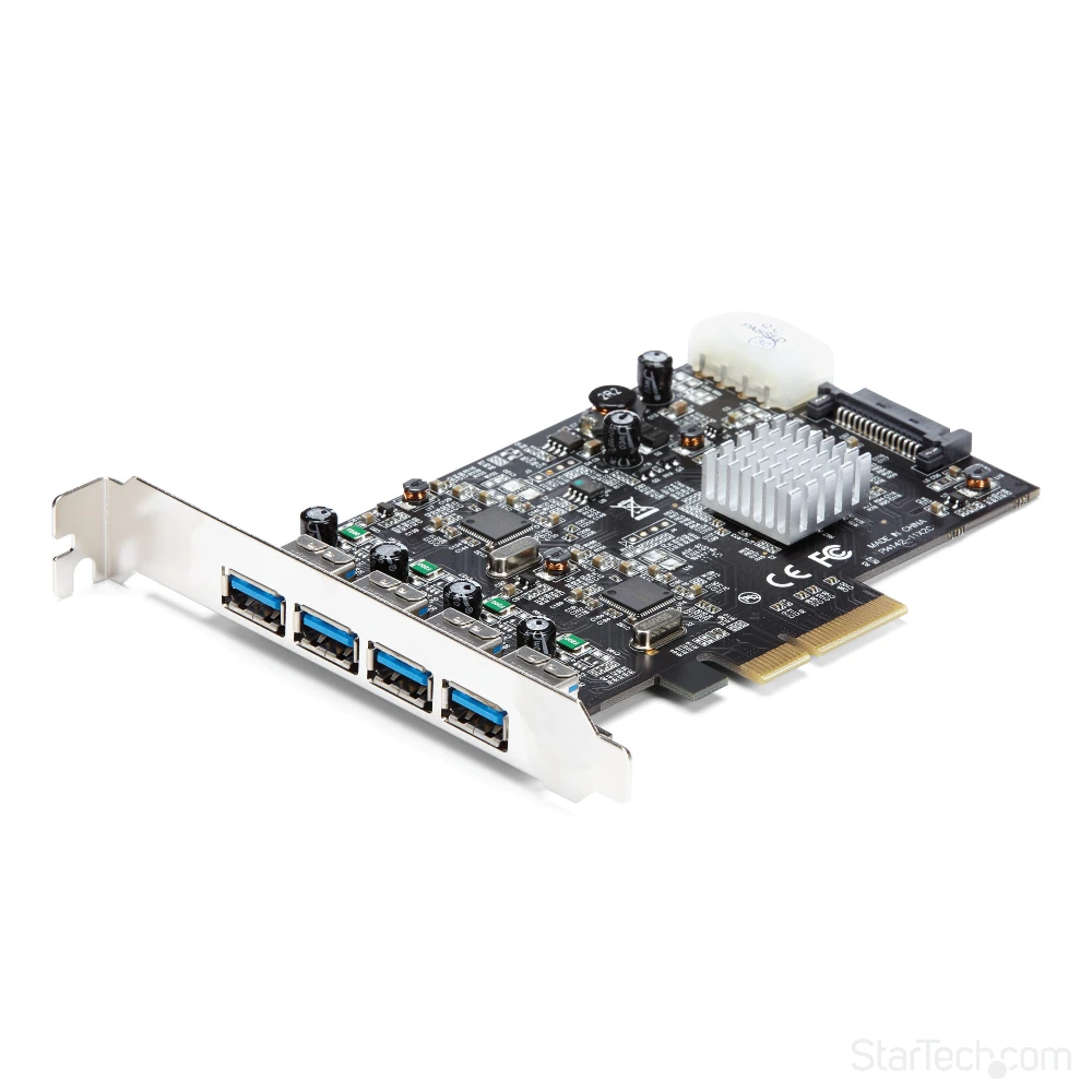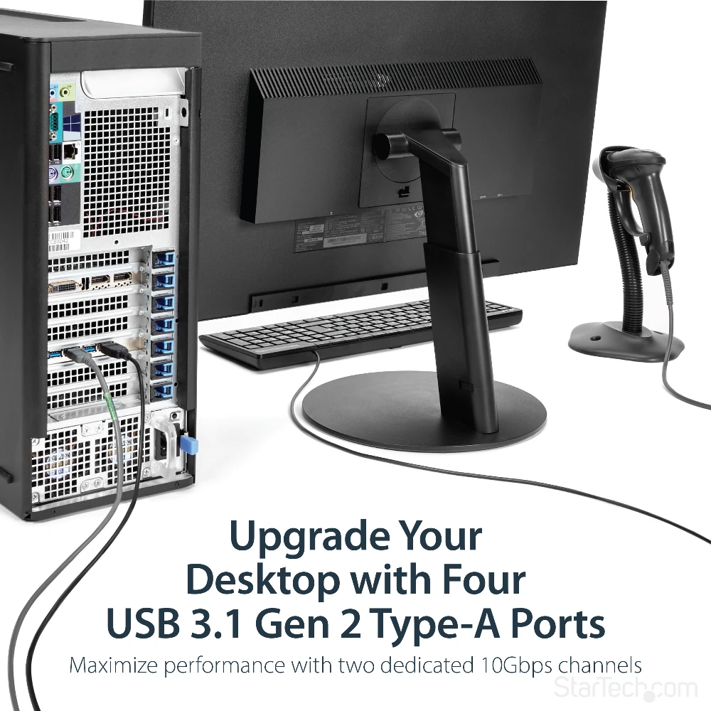 StarTech.com 4 Port USB 3.1 PCI-e Card - 10Gbps - 4x USB w/ Two Dedicated Channels - PCI Express Expansion Card / Adapter (PEXUSB314A2V) StarTech.com 4 Port USB 3.1 PCI-e Card - 10Gbps - 4x USB w/ Two Dedicated Channels - PCI Express Expansion Card / Adapter. Host interface: PCIe, Output interface: USB 3.2 Gen 1 (3.1 Gen 1), Expansion card standard: PCIe 3.0. Product colour: Black. Chipset: ASMedia - ASM1142, Data transfer rate (max): 10 Gbit/s. Windows operating systems supported: Windows 10 Education, Windows 10 Education x64, Windows 10 Enterprise, Windows 10 Enterprise x64,..., Mac operating systems supported: Mac OS X 10.10 Yosemite, Mac OS X 10.9 Mavericks, Server operating systems supported: Windows Server 2008 R2, Windows Server 2012, Windows Server 2012 R2, Windows Server 2016. Width: 120 mm, Depth: 125 mm, Height: 15 mm - Add four USB 3.1 Type-A ports with two independent 10Gbps channels to your computer through a PCI Express slot - PCIe USB card perfect for PC upgrades or builds - Expand the USB capabilities of your system with 4 new USB ports - Works with older USB 3.0 and 2.0 devices - USB 3.1 PCI-E card w/ optional LP4 or SATA power connector provides up to 900mA per port - USB Expansion Card w/ UASP - USB Card/USB 3 Card/USB PCI Card/PCI-E to USB/PCI to USB Adapter Add four USB Type-A ports with two independent 10Gbps channels to your computer, through a PCI Express slotThis USB 3.1 PCIe card lets you add four USB Type-A ports to your computer, through a PCI Express slot. With two independent 10Gbps channels, the card makes it easy to upgrade your PC to the faster speed of USB 3.1 Gen 2 so that you can access newer peripherals at twice the speed of traditional USB 3.0 (USB 3.1 Gen 1) cards.Faster USB performanceWhen multiple devices are connected, traditional single-bus USB cards share your maximum bandwidth between all ports. By employing two host controller chipsets, shared across two ports rather than four, this 4-port USB 3.1 card dedicates up to 10Gbps for each set of two USB ports. It reduces performance bottlenecks and doubles your total available bandwidth to 20Gbps.By adding 10Gbps USB ports to your computer, you can harness the speed of USB 3.1 Gen 2 and rest assured you’re ready for both current and future high-bandwidth USB-A devices.With higher data throughput support, this PCI Express USB 3.1 card is a necessity for external hard drives, hard drive enclosures, and many other USB 3.1 peripherals. Plus, the USB card includes an optional SATA or LP4 power connector to connect to your system power supply and deliver up to 900mA of power per port to USB 3.1 bus-powered devices (500mA for USB 2.0). The card is ideal for use with large external storage solutions.Shared bandwidthThe 4-port USB 3.1 card features dual independent channels to your computer and shares 10Gbps of bandwidth between two USB ports.Each set of two ports shares a combined bandwidth of 10Gbps. If a single device is accessing the channel, the card will provide data transfer rates of up to 10Gbps to the device. If two devices are accessing the channel simultaneously, the 10Gbps of bandwidth will be shared between both devices.Room for four additional devicesWith four external USB-A ports you can connect more devices to your computer. The card provides easy access to commonly-used peripherals such as your flash drive and external hard drive and allows you to connect to both current and future high-bandwidth USB-A devices.For more flexibility, you can couple the card with a USB-C to USB-A Cable (USB31AC1M) and connect your USB Type-C™ devices.Compatible with older USB devicesConnecting older peripherals isn’t a problem. This versatile USB 3.1 Gen 2 (10Gbps) card is backward compatible with legacy USB 3.0/2.0 devices that use the common USB Type-A port, so you can eliminate the added expense and aggravation of purchasing new devices.The PEXUSB314A2V is backed by a StarTech.com 2-year warranty and free lifetime technical support.The StarTech.com Advantage