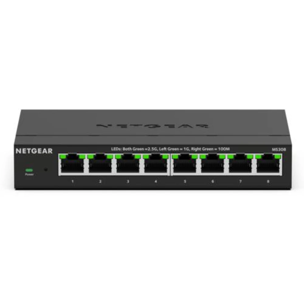 NETGEAR MS308E. Switch type: Unmanaged. Basic switching RJ-45 Ethernet ports type: 2.5G Ethernet (100/1000/2500), Basic switching RJ-45 Ethernet ports quantity: 8. Full duplex. MAC address table: 16000 entries, Switching capacity: 40 Gbit/s. Networking standards: IEEE 802.1p, IEEE 802.3, IEEE 802.3ab, IEEE 802.3az, IEEE 802.3bz, IEEE 802.3u, IEEE 802.3x. DC input voltage: 12 V. Wall mountable