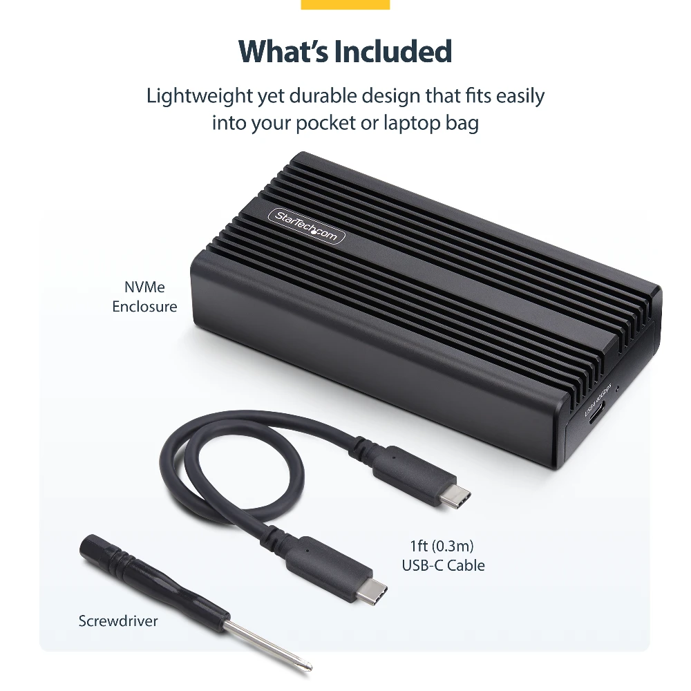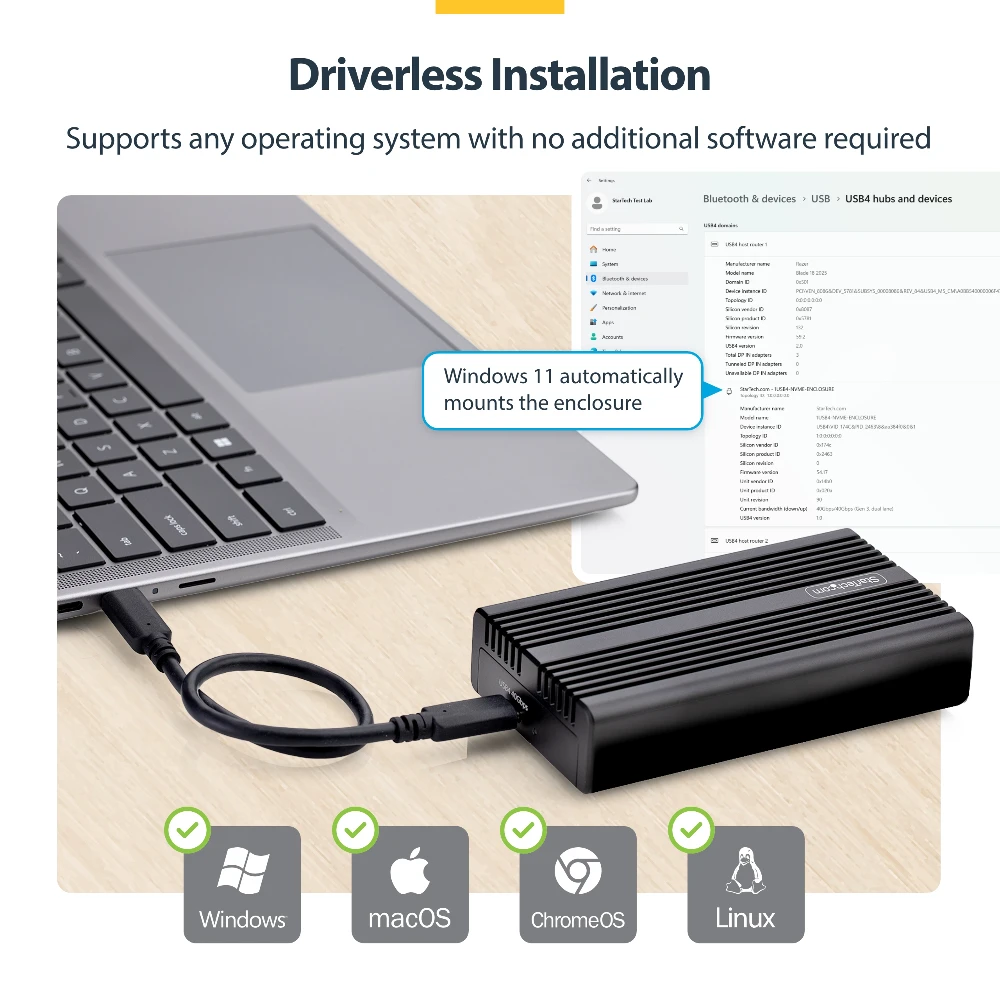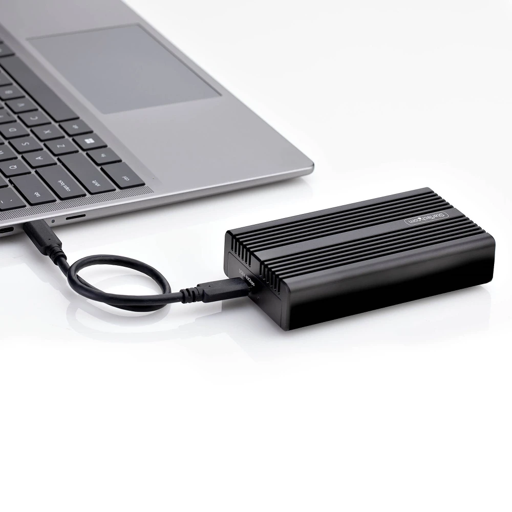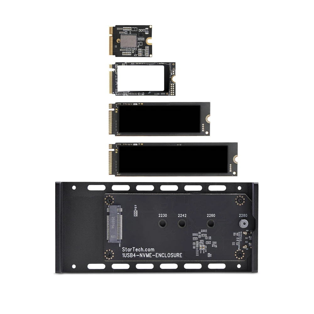 Ultra-fast USB-C enclosure for PCIe M.2 NVMe SSDs; Up to 40Gbps via a USB4 host - Thunderbolt 5/4/3/USB 3.2 compatible for seamless USB-C compatibility between enterprise laptops/workstations - Supports B+M/M-Key 2230/2242/2260/2280 M.2 NVMe including Samsung EVO 950/960/970 Kingston/Seagate/Western Digital/HP/Intel - Heatsink cover w/thermal pad for optimal heat dissipation - Perform instant backup/disk imaging; Ideal for professional applications where fast and portable NVMe access is required
