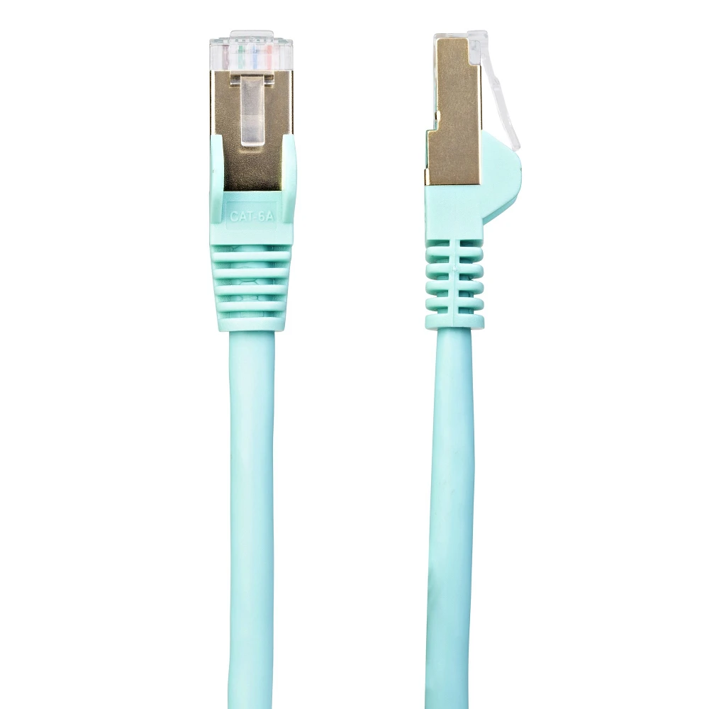 StarTech.com 7.5 m CAT6a Cable - Aqua - RJ45 Ethernet Cable - Snagless - CAT6a STP Cord - Copper Wire - 10Gb (6ASPAT750CMAQ) StarTech.com 7.5 m CAT6a Patch Cable - Shielded (STP) - 100% Copper Wire - Snagless Connector - Aqua. Cable length: 7.5 m, Cable standard: Cat6a, Cable shielding: U/FTP (STP), Connector 1: RJ-45, Connector 2: RJ-45, Data transfer rate: 10000 Mbit/s, Product colour: Aqua colour - 7.5 m CAT6a Ethernet cable meets all Category 6a patch cable specifications to deliver a reliable 10GBase-T Ethernet - Tested for up to 500MHz frequency - CAT 6a cable features 100% copper and foil-shielded twisted-pair wiring to prevent EMI interference - 50-micron gold connectors deliver optimum conductivity and eliminate signal loss due to oxidation or corrosion - Snagless connectors and moulded boots on the aqua CAT6a network cable protect the RJ45 clips during installations 7.5 m CAT6a Patch Cable | Shielded (STP) | Snagless | 100% Copper Wire | Aqua